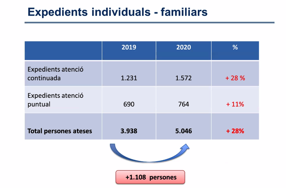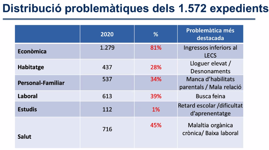 Per tipus de família, l’atenció a persones soles va ser la que més va augmentar, un 41%, de manera que van ser ateses 657; seguides de les monoparentals, que van ser 521, un 34% més que el 2019. Quant al motiu de l’atenció, en un 81% dels casos va ser per problemes relacionats amb l’economia, en un 45% amb la salut i en un 39% amb la feina. En relació amb el 2019, la problemàtica econòmica va augmentar un 20% i la laboral, un 109%.