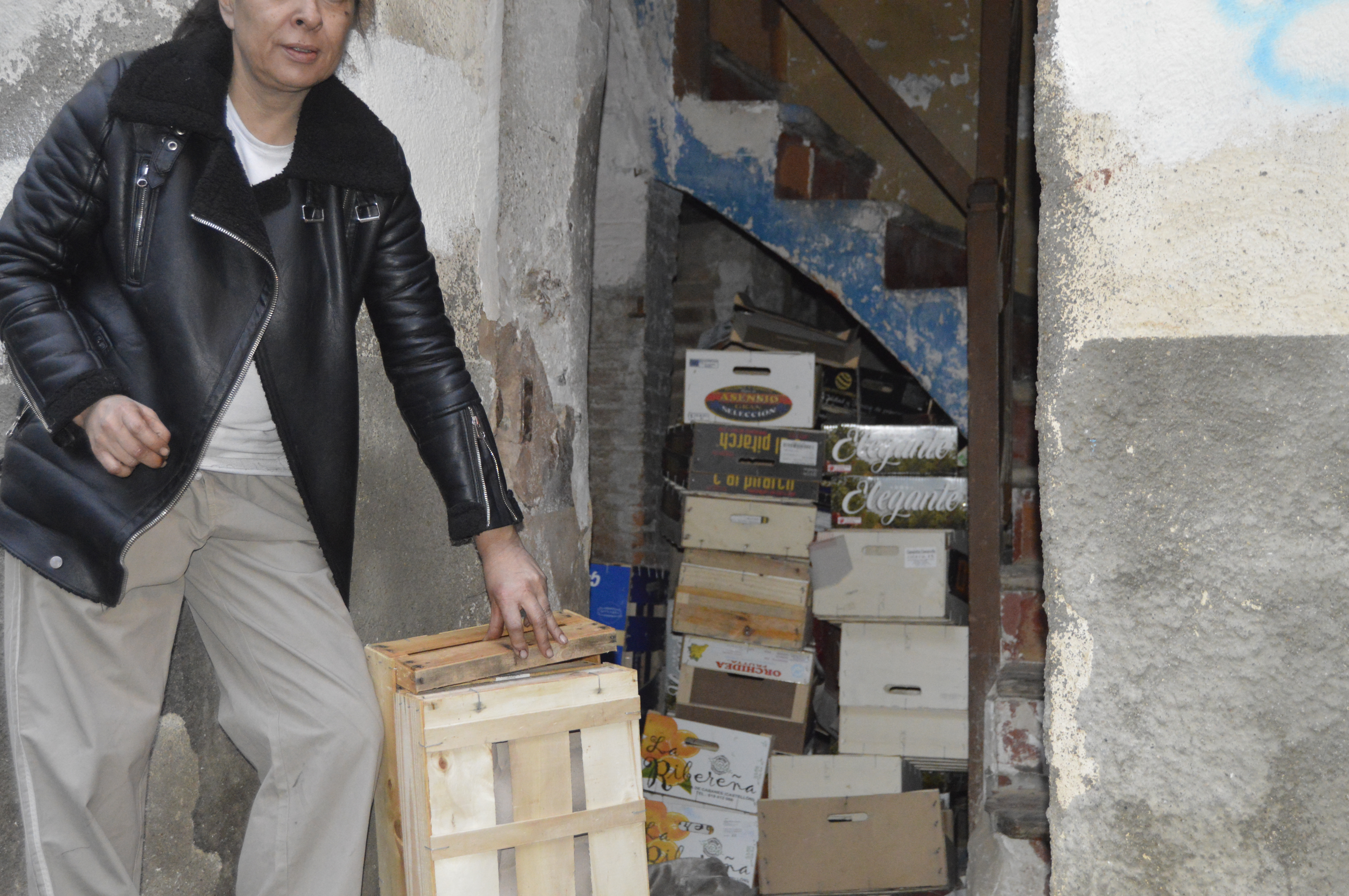 La Sandra es va instal·lar –per dir-ho d’alguna manera– fa tres setmanes en aquest edifici en ruïnes del centre de la ciutat acompanyada per la seva parella. Ell va marxar de seguida: no ho aguantava, va dir. De tant en tant torna. Té por del perill que suposa aquella estufa, de cremar-se viva, un dels perills d’aquell infrahabitatge, rates i insectes a banda. També els veïns deuen témer que un dia hi hagi una desgràcia. Alguns són, precisament, els que faciliten a l’okupa l’únic sustent a què pot accedir: els dies de mercat li porten menjar i alguna garrafa d’aigua. Alguna vegada, ha hagut de passar per una carnisseria i demanar si li donaven alguna cosa amb proteïna. “Sempre me n’han donat”.
