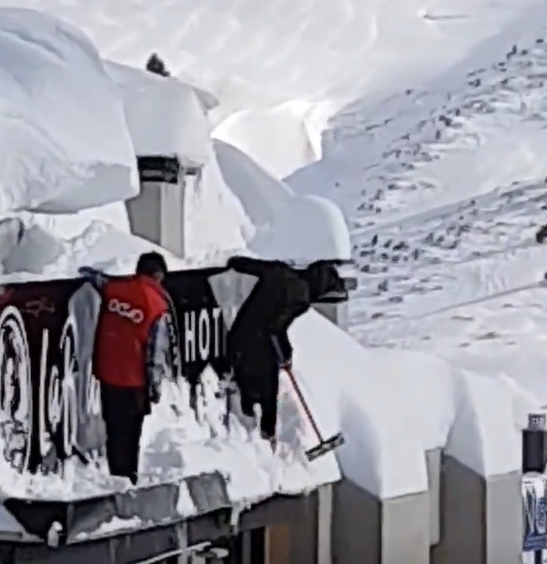El vídeo s'ha compartit a través de les xarxes socials i ensenya com aquestes dues persones s'agafen amb una mà al cartell de l'hotel i amb l'altre intenten fer caure la neu de la teulada mentre al carrer la gent passeja i alguns miren amb estupefacció l'acció que s'està realitzant.