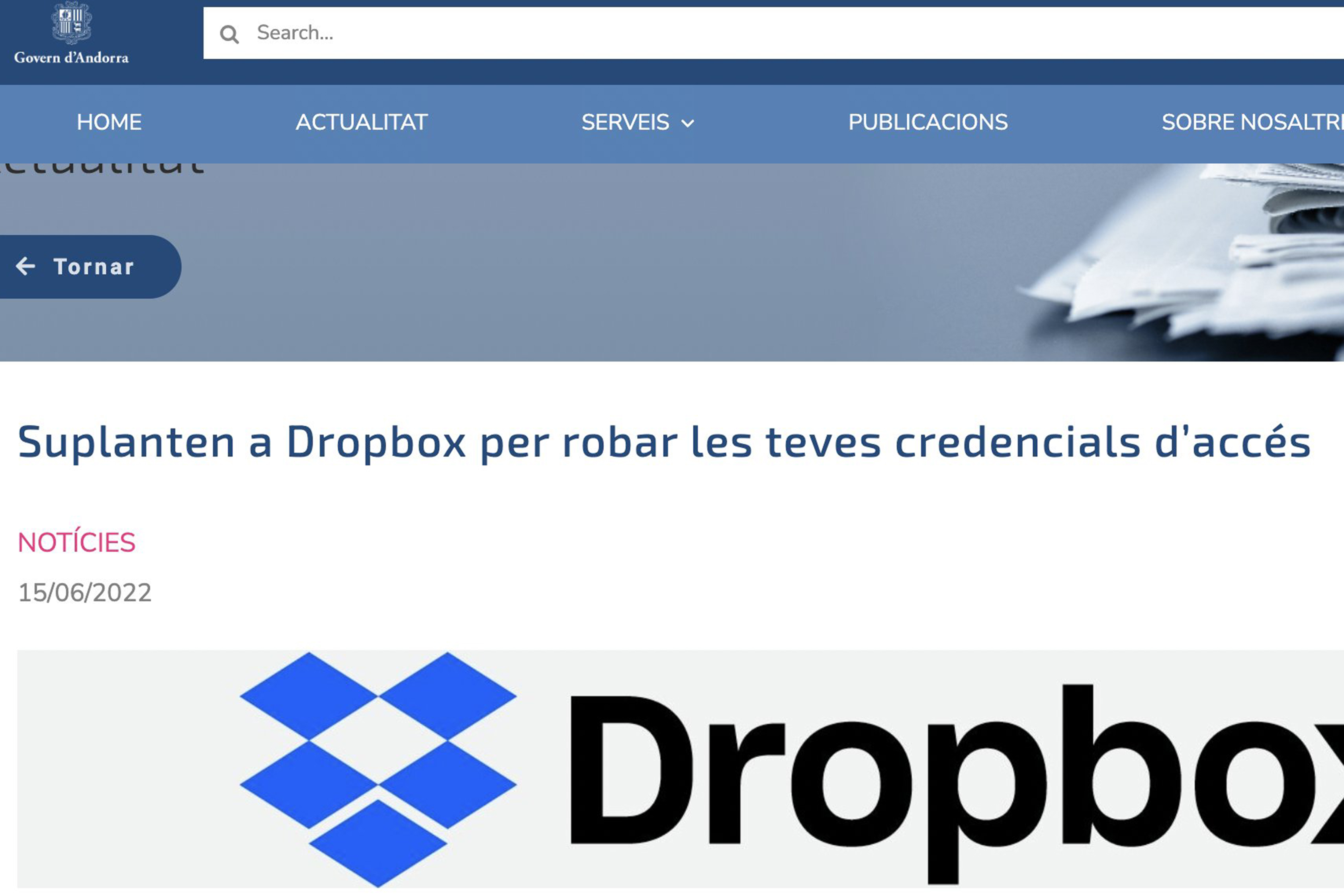 L'Agència Nacional de Ciberseguretat d'Andorra (ANC-AD) alerta que s'ha detectat una campanya de correus electrònics fraudulents, coneguda com a phishing, que suplanta la plataforma d'emmagatzematge al núvol Dropbox. Aquesta campanya utilitza com a ganxo un enllaç a un document que redirigeix l'usuari cap a una pàgina falsa en la qual se sol·licita que introdueixi les credencials d'accés a la plataforma. És en aquest moment quan els ciberdelinqüents aprofiten per a robar les dades.