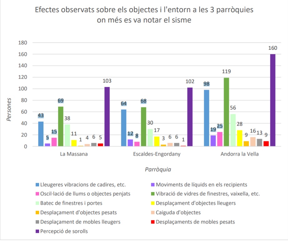 En aquest sentit, van ser Andorra la Vella, la Massana i Escaldes-Engordany les parròquies on més es va notar el terratrèmol. A Andorra la Vella fins a 252 persones van afirmar haver-lo notat, al majoria a la capital. En el cas de la Massana van ser 151 les respostes positives, i a Escaldes en van ser 146. En canvi Canillo, amb només 23 respostes, és on menys persones van respondre l'enquesta.