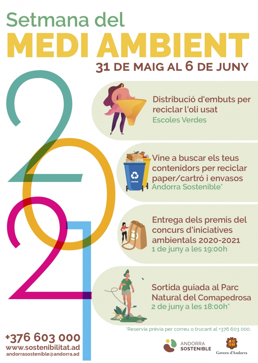 Aquest proper dimarts 1 de juny està prevista l’entrega de premis del concurs d’iniciatives ambientals 2020-2021 que reconeixerà i donarà visibilitat als projectes i accions que es duen a terme al país en matèria ambiental, aquest any amb un premi especial sobre economia circular. Per qui tingui ganes de sortir a la natura, el dia 2 de juny a partir de les 18 hores està prevista una sortida guiada al Parc Natural del Comaperosa. Per assistir a aquest acte, així com per recollir els contenidors, cal fer una reserva prèvia trucant al telèfon +376 603 000 o a través del correu andorrasostenible@andorra.ad.