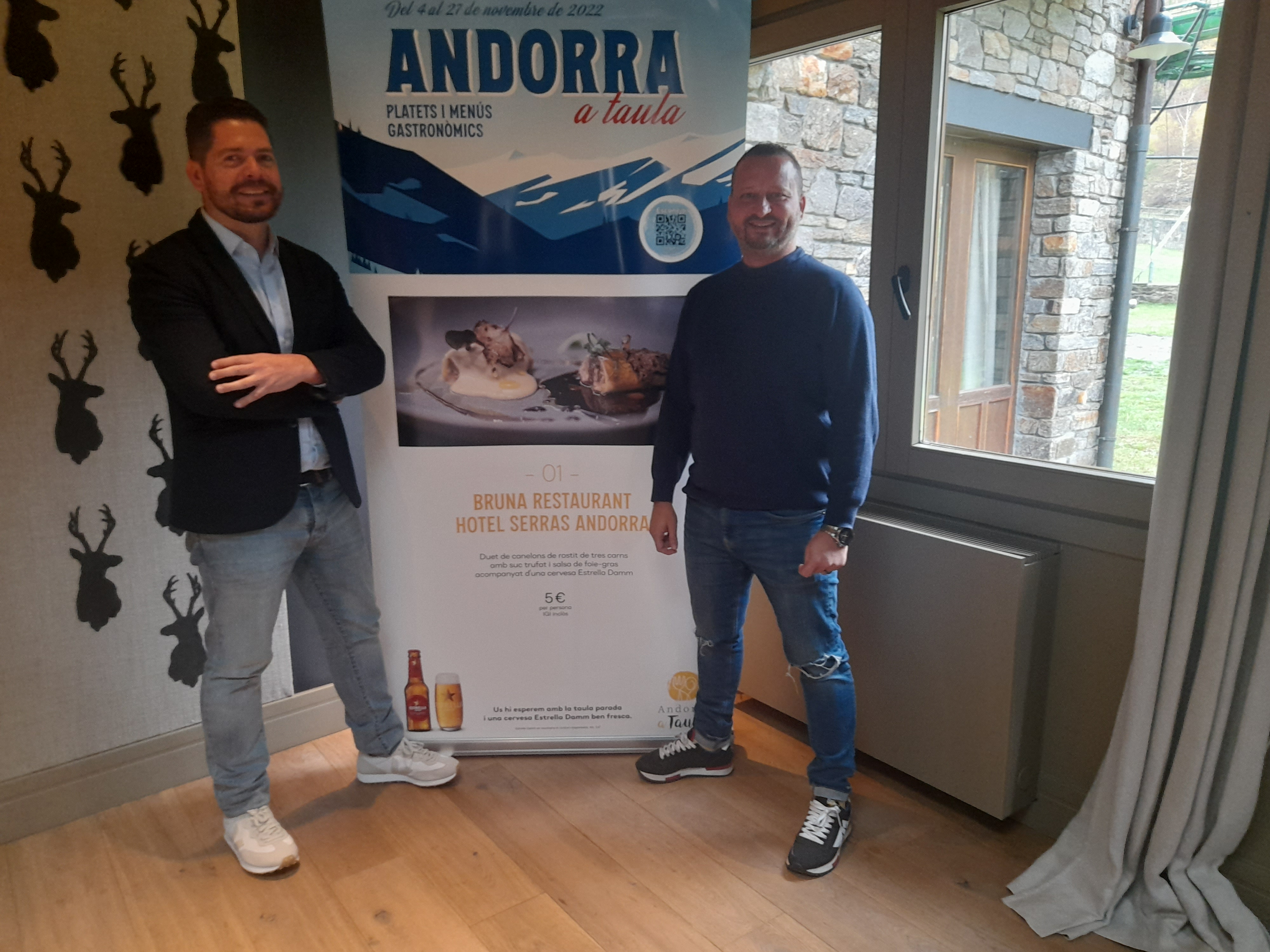 La setzena edició de l’Andorra a Taula arrenca demà mateix i s’allargarà fins al 27 de novembre, coincidint així en el temps amb l’Andorra Shopping Festival. Enguany, la principal novetat de les jornades és “el platet d’autor” que oferiran alguns dels 26 establiments que s’han adherit a la iniciativa. Ho han explicat aquest matí el director de la Unió Hotelera d’Andorra, Jordi Pujol, i el director de l’hotel Serras Andorra, Carlos Cardona. Precisament el restaurant Bruna d’aquest establiment hoteler serà un dels quatre que oferirà aquesta mena de plat previ o entrant. En el seu cas, un duet de canelons de rostit de tres carns amb suc trufat i salsa de foie-gras acompanyat d’una cervesa Estrella Damm.