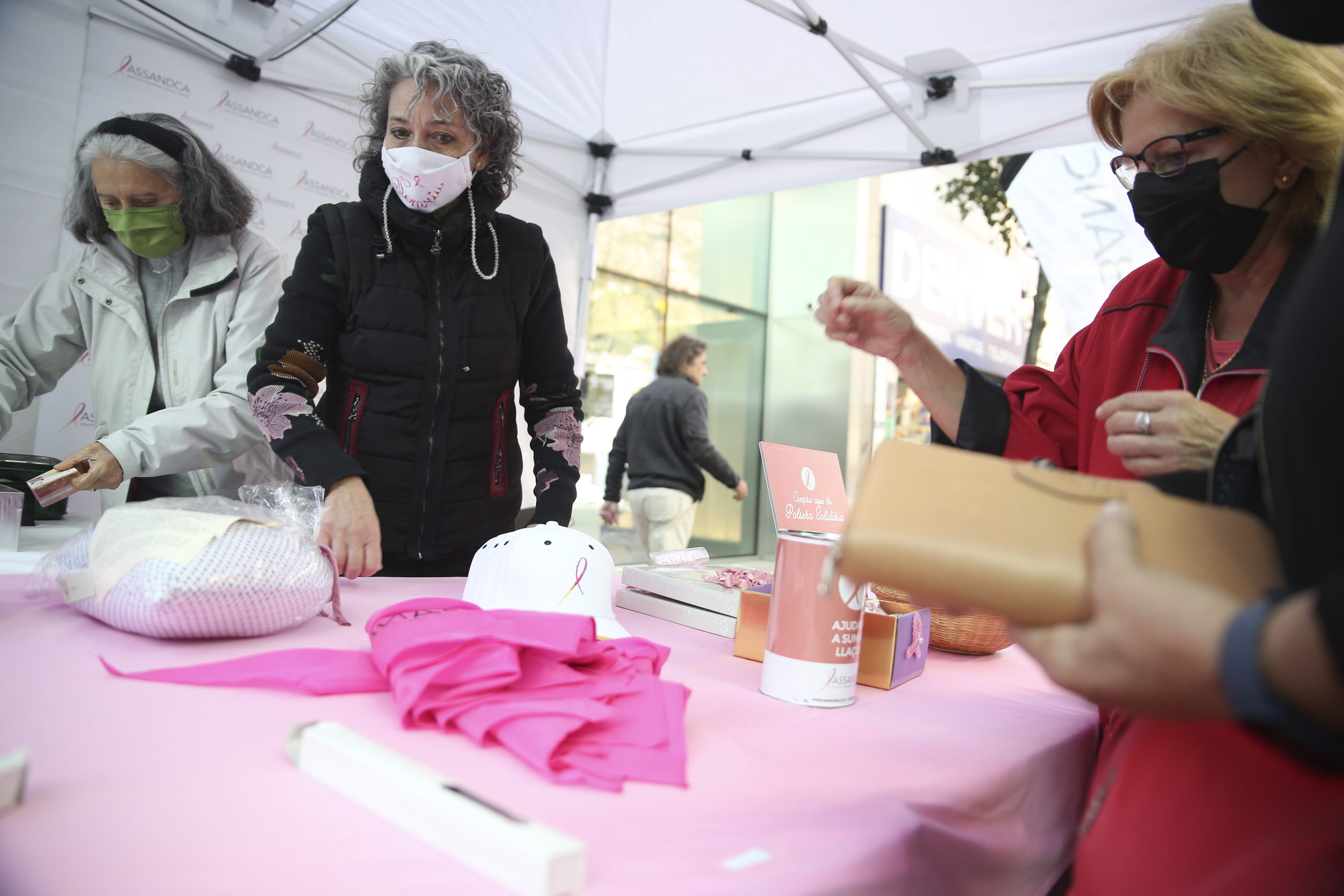 Dues parades. Una a l’avinguda Carlemany i l’altra a la plaça Rebés. Les atenen per torn voluntàries d’Assandca. A la tarda, la Dolors i la Feli fan petar la xerrada amb els passavolants que s’acosten en veure la carpa i el motiu. Alguns són de fora del país, d’altres amigues i coneguts, homes i dones, diuen, tot i que potser les dones són les que més s’hi encanten perquè les coneixen i perquè moltes d’elles han passat la malaltia. Venen les polseres solidàries, “que aquest any són molt maques perquè a més porten el llacet”, fa notar la Dolors. També arracades, gorres, mocadors i alguns llibres. Hi ha gent que tot i que no necessiten res fan la seva aportació, sobretot les que han tingut càncer de mama.
