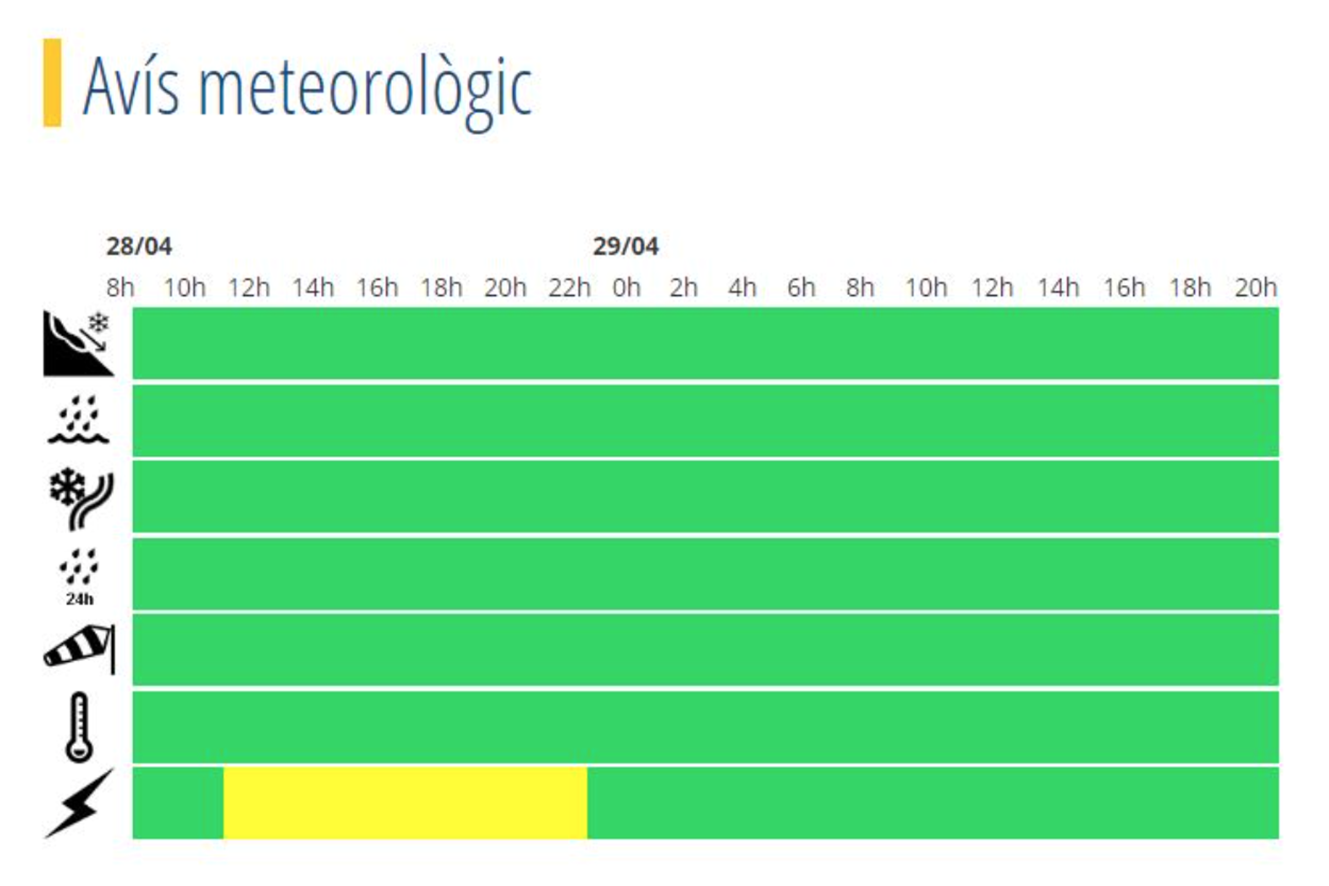 És per aquest motiu que des de Protecció Civil s'ha activat l'avís groc per tempestes a partir d'aquesta tarda i nit, ja que els ruixats poden ser intensos i anar acompanyats d'activitat elèctrica. Es demana precaució a l'exterior i durant els desplaçaments, així com assegurar els objectes que puguin caure de balcons i terrasses.