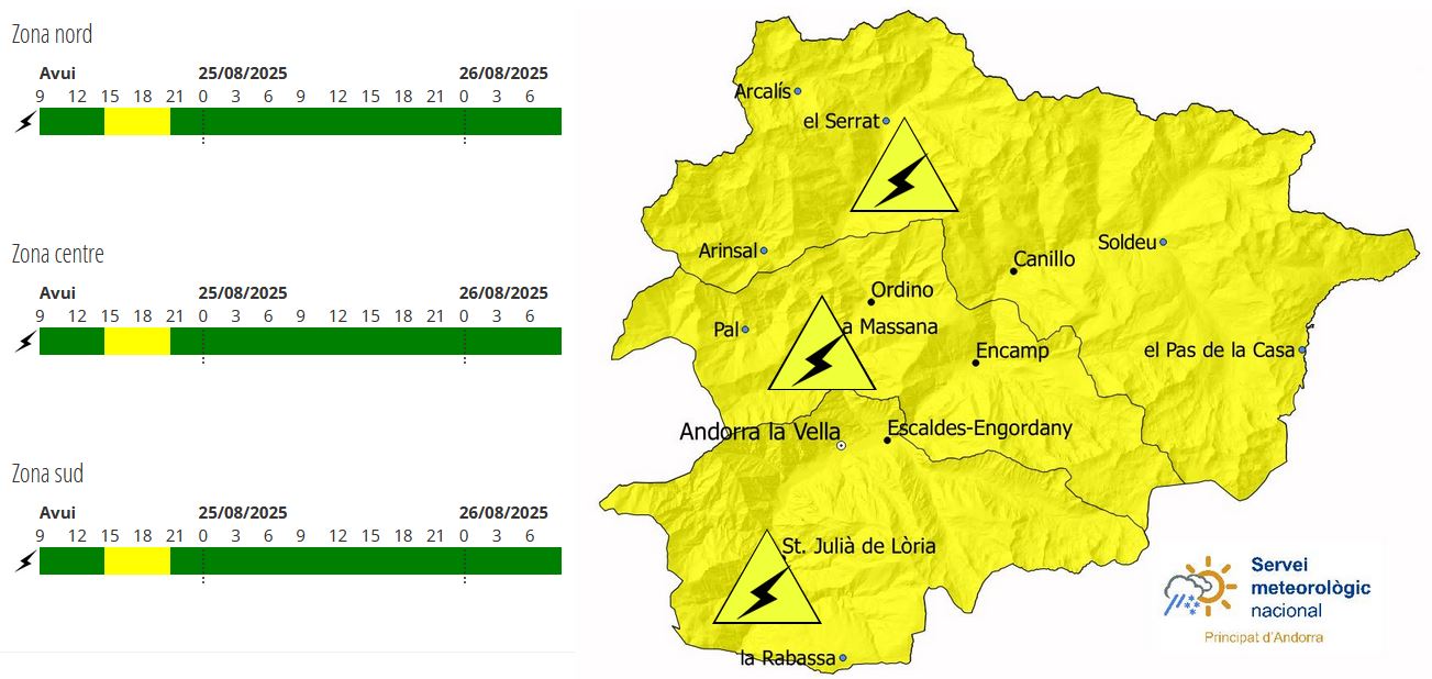 El Servei Meteorològic d'Andorra ha activat l'avís groc per les tempestes previstes per aquesta tarda a Andorra que, tot i ser localitzades, poden anar acompanyades de calamarsa i ser puntualment intenses. En concret, l'alerta s'ha previst entre les 3 de la tarda i les 9 de la nit. Des de Protecció Civil, es recomana prudència si se surt a la muntanya i seguir els consells de seguretat.