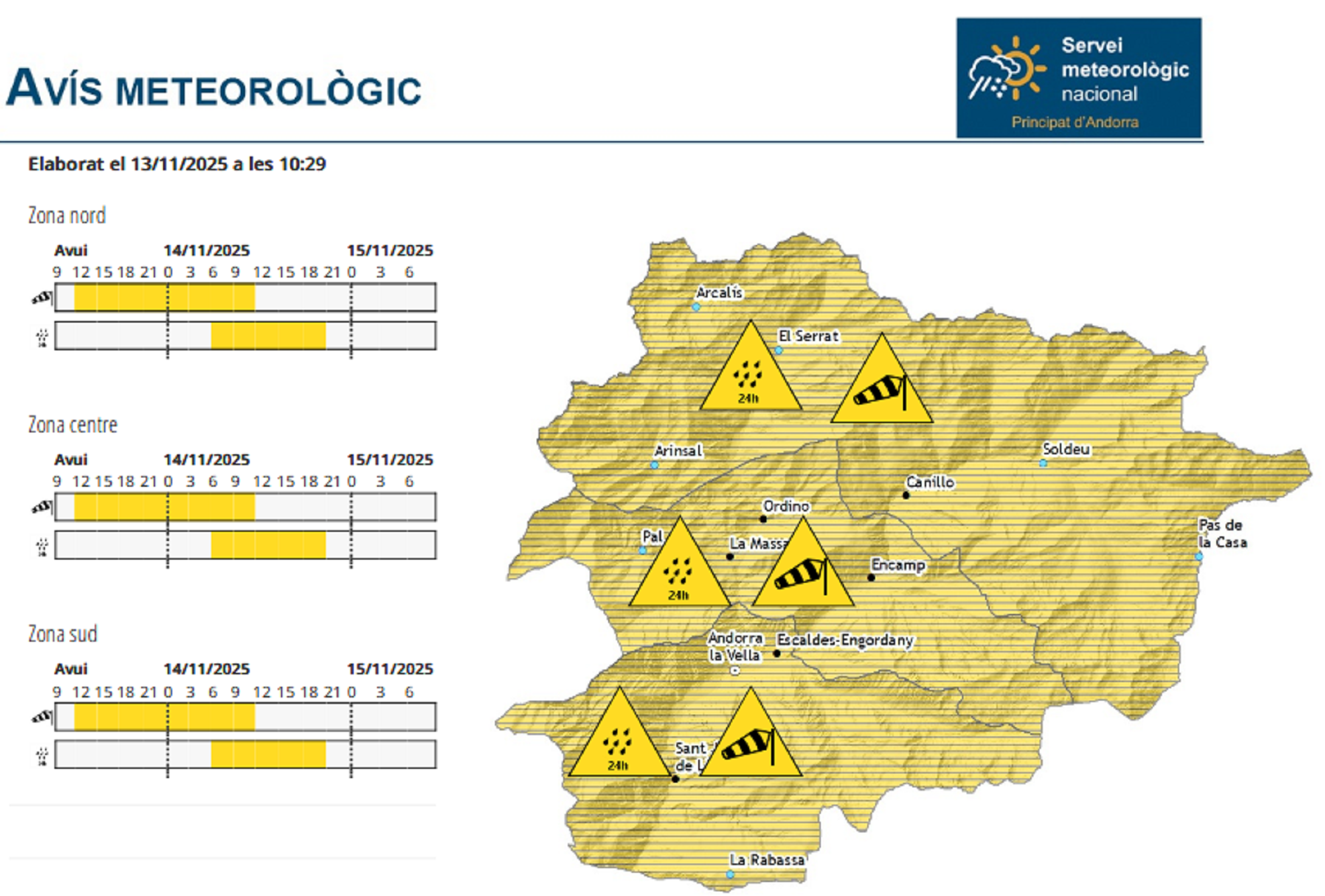 Aquestes persistiran fins al vespre, i en un primer moment, aniran acompanyades de fang. A l'inici de l'episodi la cota de neu se situarà al voltant dels 2.600 metres, i anirà pujant fins als 2.800 durant el matí. A primeres hores de la tarda, coincidint amb la màxima intensitat de la precipitació, podrà baixar ràpidament fins als 2.300.