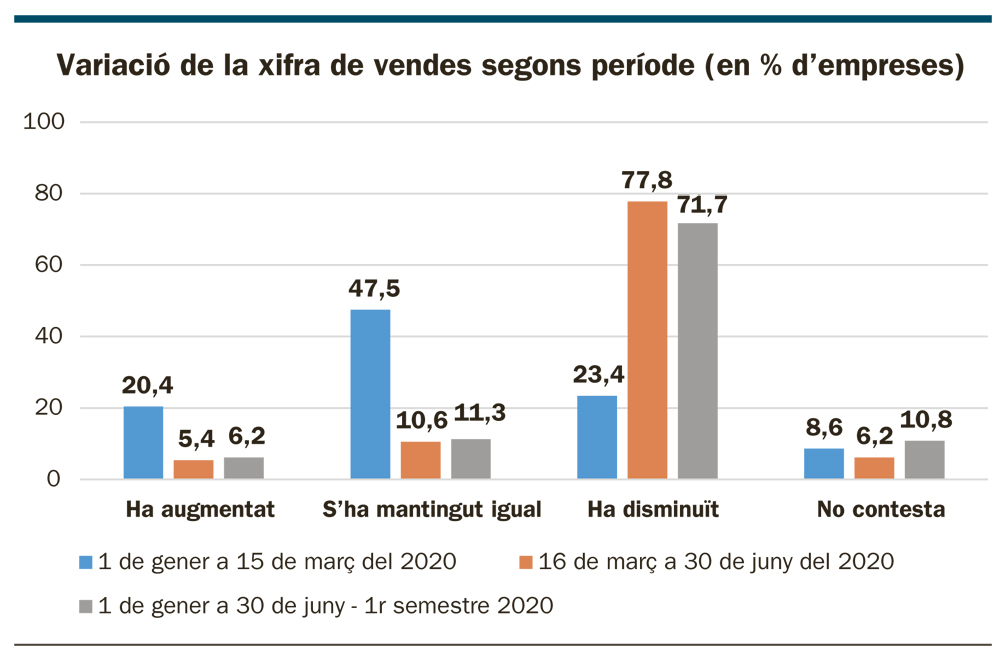 Així, un 72% de les empreses i autònoms enquestats manifesten haver patit una caiguda de la xifra de vendes a causa de l’afectació de la Covid-19. Només un 6% parlen d’una evolució a l’alça de les vendes en comparació amb el mateix període del 2019 i un 11% indica un comportament estable dels nivells d’activitat.