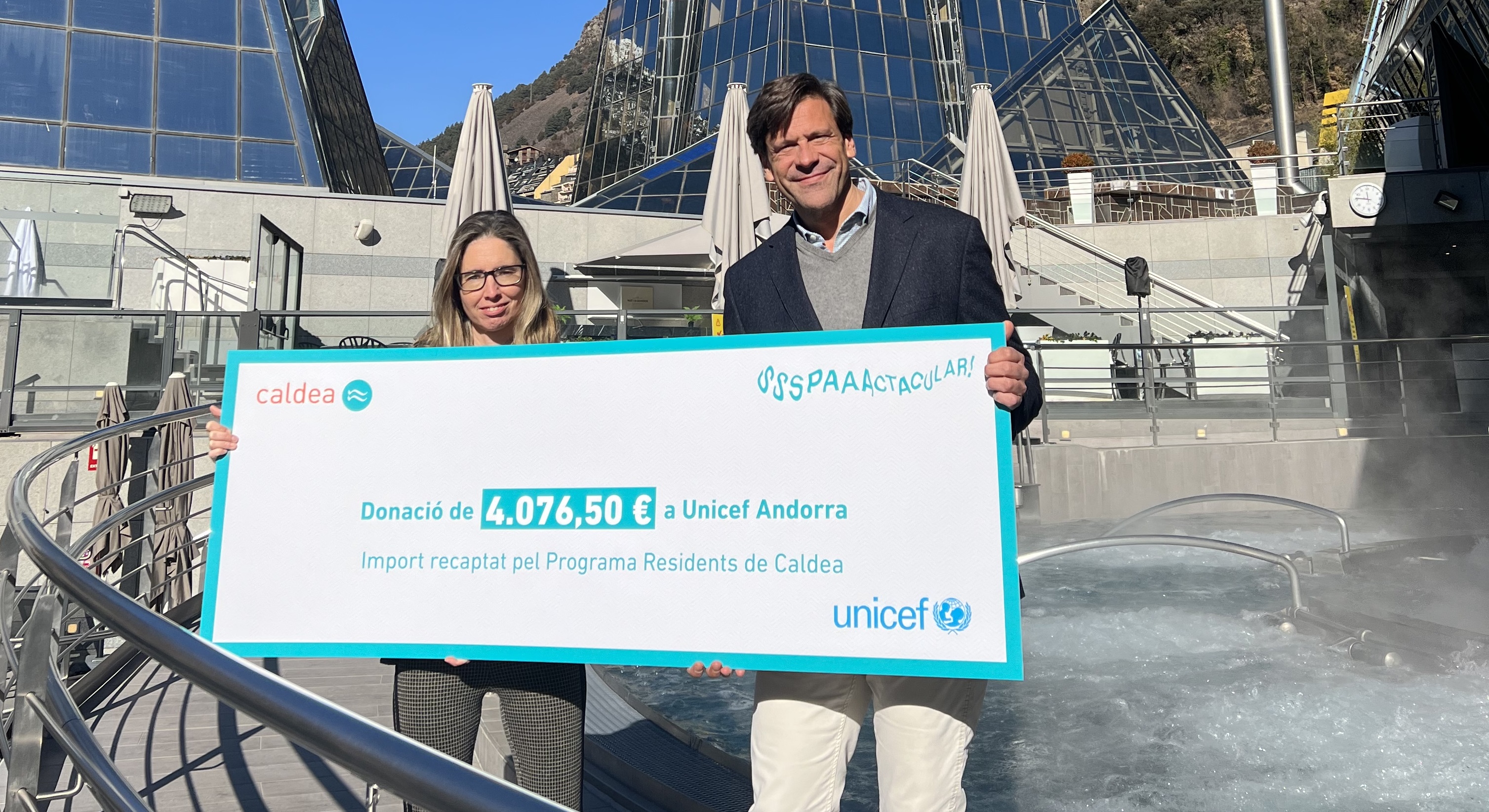 Caldea ha fet entrega d’un donatiu de 4.076,50 euros a Unicef Andorra. Aquesta donació s’emmarca en el conveni de col·laboració que les dues entitats van signar l’any 2014 pel qual el termolúdic dona a Unicef 0,50 euros de cada entrada venuda en el marc del Programa Aigua.