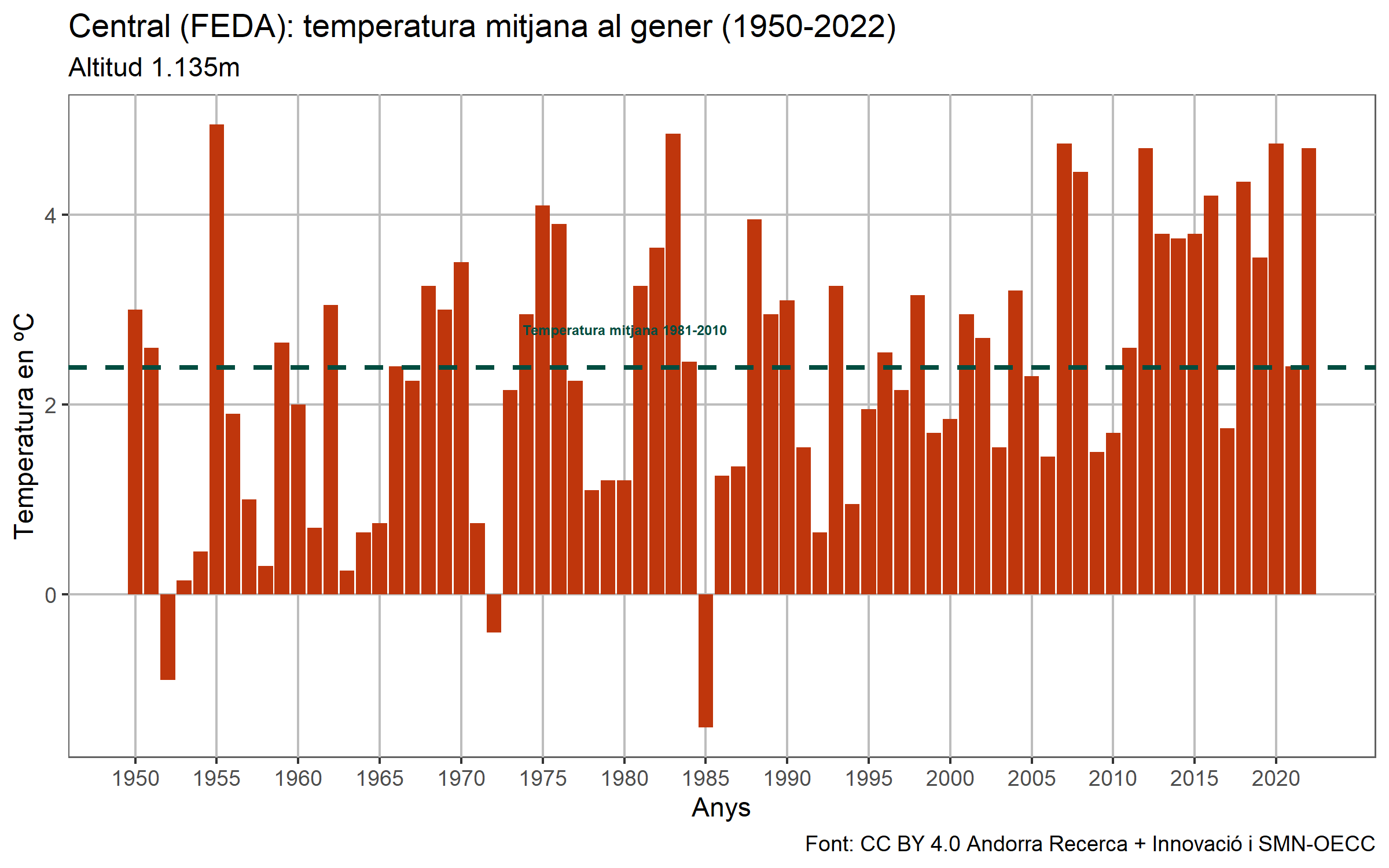 Temperatures cada vegada més altes a l’hivern, i no només en aquesta estació, sinó de manera generalitzada tot l’any, un efecte típic del canvi climàtic que ens afecta. Sense anar més lluny, segons els gràfics publicats ahir per Andorra Recerca i Innovació (ARI), la temperatura del mes de gener ha estat 2,3 graus per sobre de la mitjana dels darrers 30 anys. Una situació que continua essent “preocupant” i que “malauradament comencem a assumir”, diu el meteoròleg Guillem Martín del Servei Meteorològic Nacional. I és que si ens ho mirem objectivament les temperatures estan pujant i fa saltar l’alarma el fet que l’any passat no hi hagués cap mes amb cap anomalia negativa: “tots els mesos del 2021 van ser càlids”, afirma, i això és “anormal”, un signe incontestable del canvi climàtic.