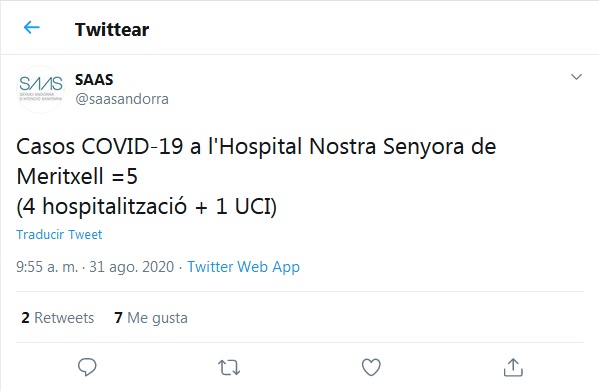 El SAAS ha informat aquest matí que hi ha una nova persona ingressada a l'hospital per coronavirus. Després que divendres indiqués que ja eren 4 els hospitalitzats, avui se suma un més si bé només hi ha una única persona ingressada a l'UCI. Cal tenir present que divendres el Govern es va mantenir en què només eren 3 les persones ingressades a l'hospital indicant que el quart era algú que ja havia negativitatzat el virus i que per tant es trobava al centre mèdic per altres patologies. La previsió és que avui des de l'Executiu s'actualitzin de nou les dades relacionades amb la crisi sanitària per saber els resultats de les proves realitzades durant el cap de setmana, entre les quals hi ha les relacionades amb els positius detectats als esports d'estiu.