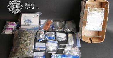 El segon ocupant, un resident espanyol de 28 anys, va negar que portés qualsevol tipus de droga, però l’escorcoll va permetre trobar dins la seva roba interior dos embolcalls amb 4,17 grams de speed i 5,5 grams de cristall, conegut també com a MDMA o metilendioximetanfetamina. Posteriorment, durant el registre al seu domicili es van trobar 295,50 grams de marihuana en diferents indrets, així com una bàscula i productes farmacèutics per adulterar la droga.