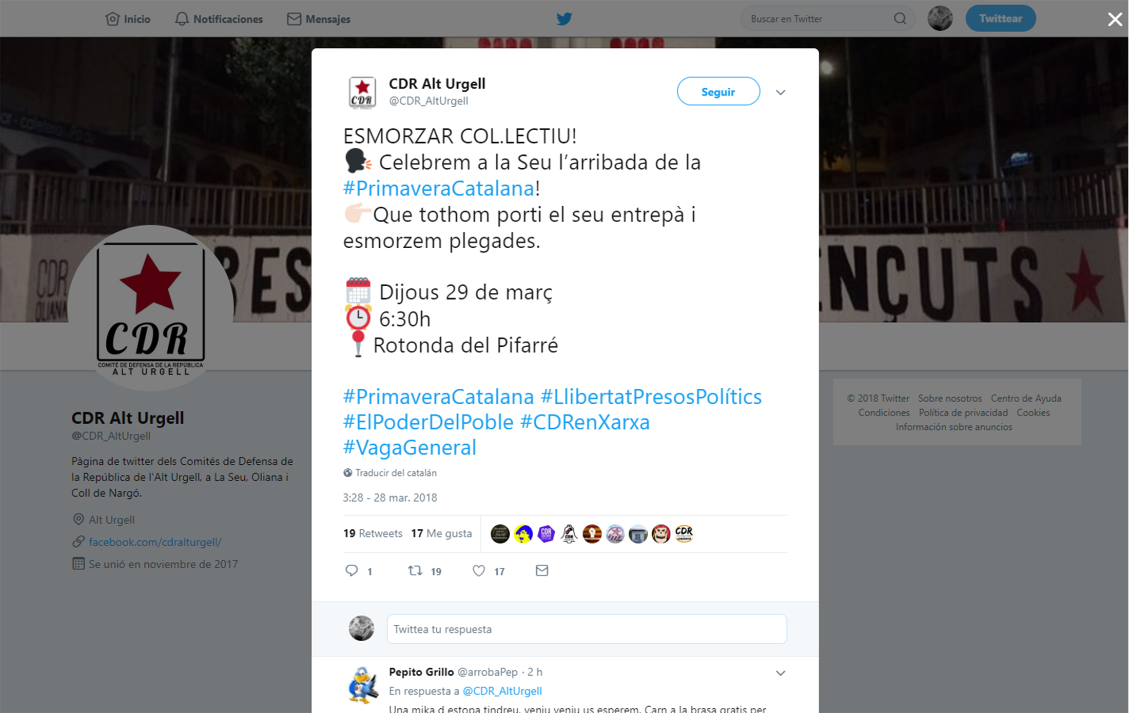 Per altra banda, remarquem que durant aquesta setmana i també a les xarxes socials s’ha fet pública la creació d’un CDR a Andorra. Ara per ara, per part d’aquest comitè no hi ha hagut cap presentació pública ni cap manifestació de mobilitzacions a fer dins del territori andorrà.