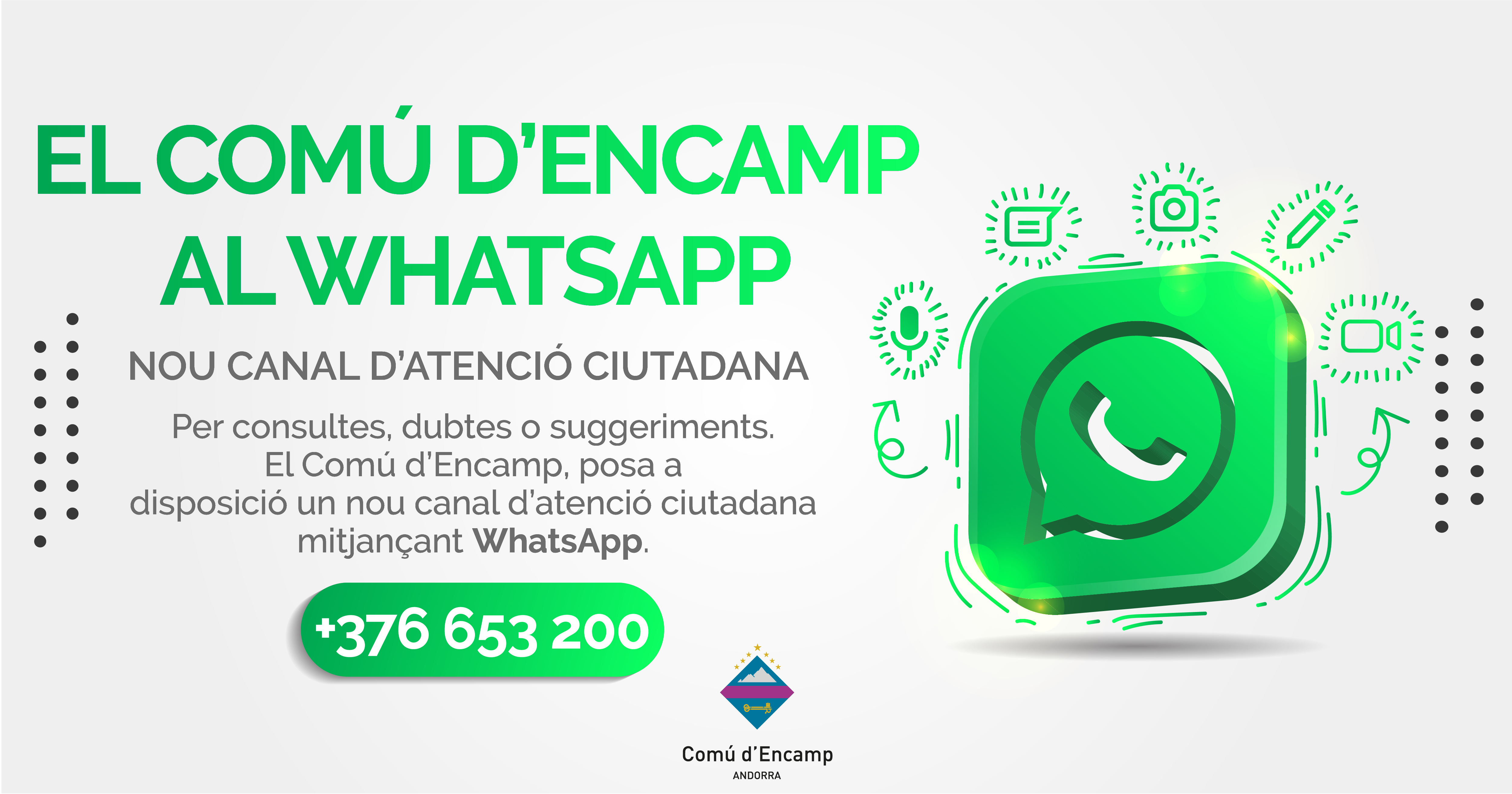 El Comú d'Encamp posa en funcionament un nou canal de comunicació al servei de la ciutadania a través de Whatsapp, amb el número de telèfon mòbil 376 653 200. El cònsol menor d'Encamp, Jean Michel Rascagnères, ha assegurat que "la voluntat és utilitzar una eina molt implantada entre la població per fer més fàcil la comunicació i apropar encara més el comú a la ciutadania".