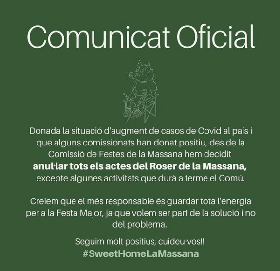 Al comunicat fet públic per les xarxes socials, la comissió de festa ha decidit suspendre els actes arran de l'augment de casos de Covid del país "i que alguns comissionats han donat positiu". Finalment, exposen que "el més responsable" en aquests moments és guardar les energies de cara a la festa major.