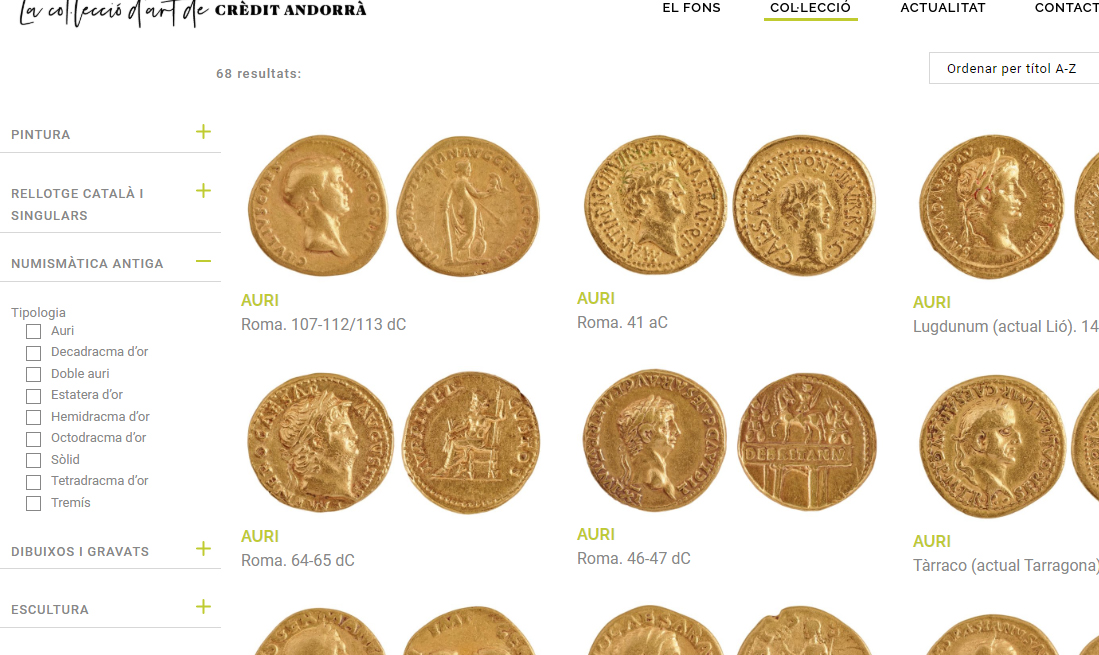 Les monedes d’or antigues que es poden veure per primera vegada en el nou web del fons d’art es distribueixen en una petita selecció de monedes gregues (des de Siracusa i Macedònia fins a Alexandria), auris de l’època imperial romana –bona part de la col·lecció–, diversos sous bizantins i algunes monedes visigòtiques.
