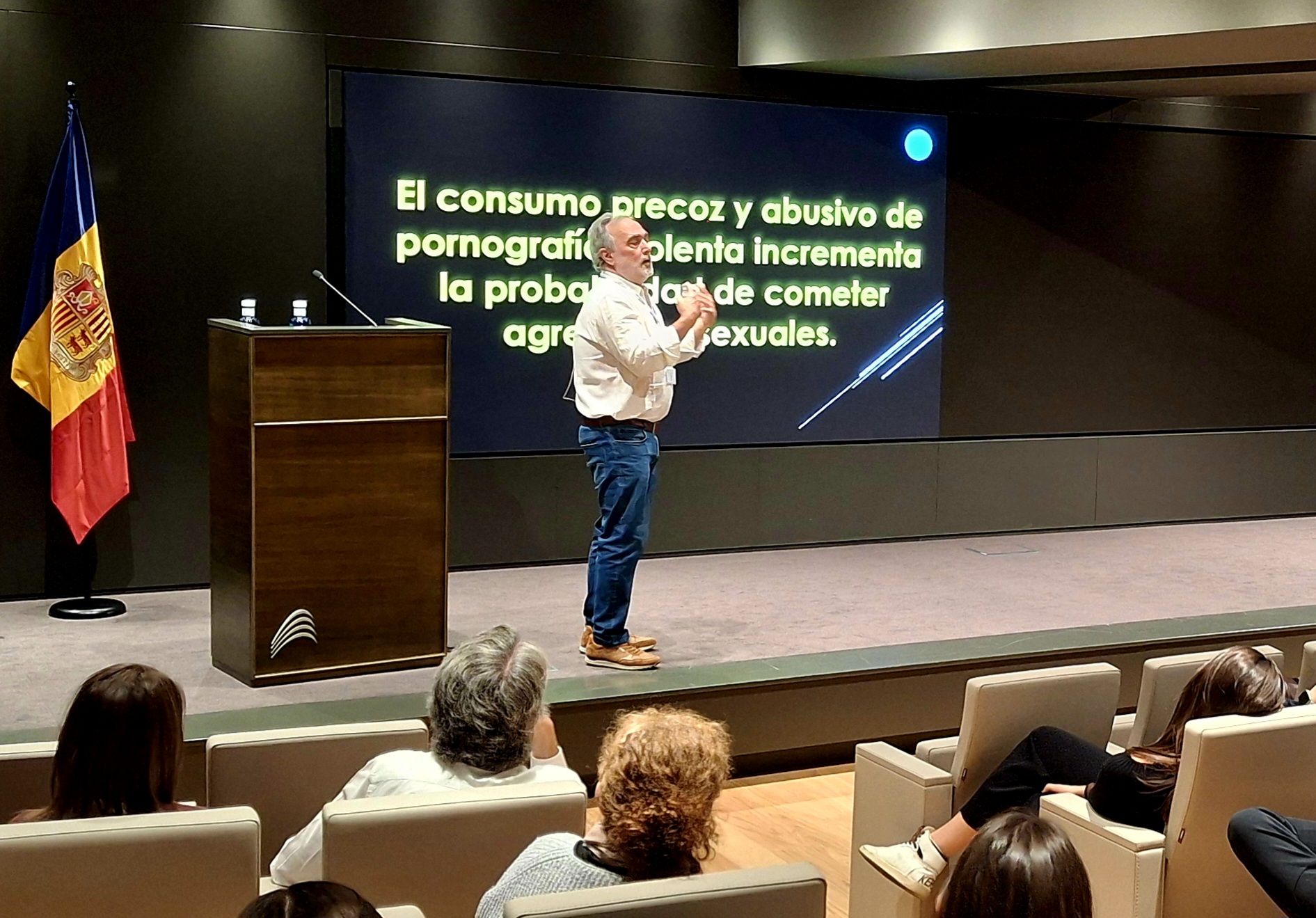 La conferència es va fer davant els alumnes de batxillerat del Sant Ermengol, però es va retransmetre en directe a la resta d’alumnes de batxillerat d’escoles del país i també, gràcies a Cooperand, a estudiants de Bolívia. En total eren uns 10.000 espectadors, i els nanos que estaven a la sala van experimentar diverses emocions. En alguns moments hi havia aquell típic ambient –del qual la majoria també n’hem format part quan érem jovenets– que barreja la conya amb la vergonya. “Bua, aquest paio parla de tetes, tio!”. I ji ji per aquí i ja ja per allà. “Tia, que asco!”, i altres expressions. García entén perfectament aquestes reaccions, “són joves, és normal”. Però d’altra banda, es van sentir molts pocs “xist!” dels professors. És a dir, van mostrar interès en el que els explicava el psicòleg navarrès. Es miraven entre ells, comentaven i fins i tot hi va haver algunes preguntes al final de la conferència. En fi, que no va ser la típica excursió que et fa saltar el col·le i ja està, sinó que van estar igual d’atents que a una classe de biologia. Oi que sí, nois?