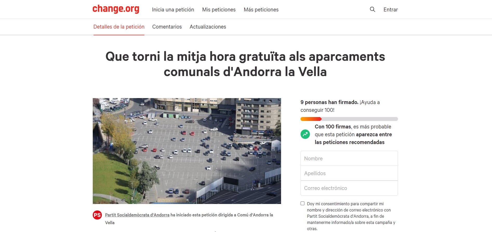 La petició, sota el títol “Que torni la mitja hora als aparcaments comunals d’Andorra la Vella”, té com a objectiu que la ciutadania pugui dir la seva signant aquest reclam i assolir així el màxim nombre de firmes possibles per tal de presentar-les a la propera sessió de consell de Comú i fer replantejar la mesura als cònsols de la capital.
