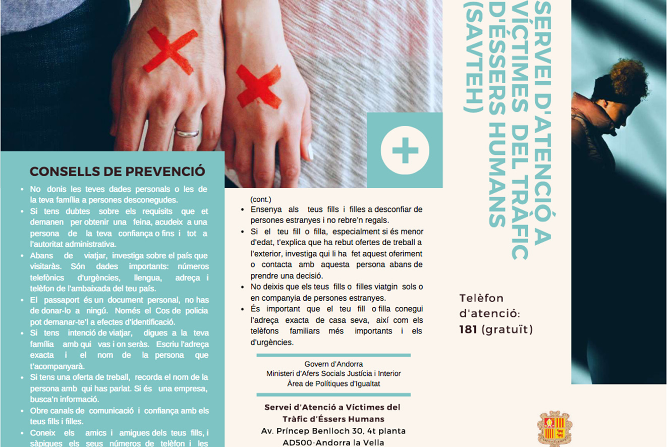 D’aquesta manera, Andorra va signar el 2011 el conveni del Consell d’Europa contra el tràfic d’éssers humans i el 2017 es va aprovar la llei de mesures per lluitar contra el tràfic d’éssers humans i protegir-ne les víctimes, de la qual deriva el protocol nacional que determina els agents que hi han d’intervenir i el circuit a seguir. Així, en cas que la policia o la fiscalia determinessin que existeix un cas de tràfic d’éssers humans derivarien les víctimes al servei, que compta amb educadora social, psicòleg i jurista per atendre aquestes persones. A més, es disposa també de pisos on les víctimes podrien ser acollides. El servei compta, a més, amb el telèfon 181, que funciona les 24 hores del dia; en cas que a través d’aquesta via es notifiqués un cas, des del servei s’informaria a la policia i a la fiscalia perquè poguessin també intervenir.