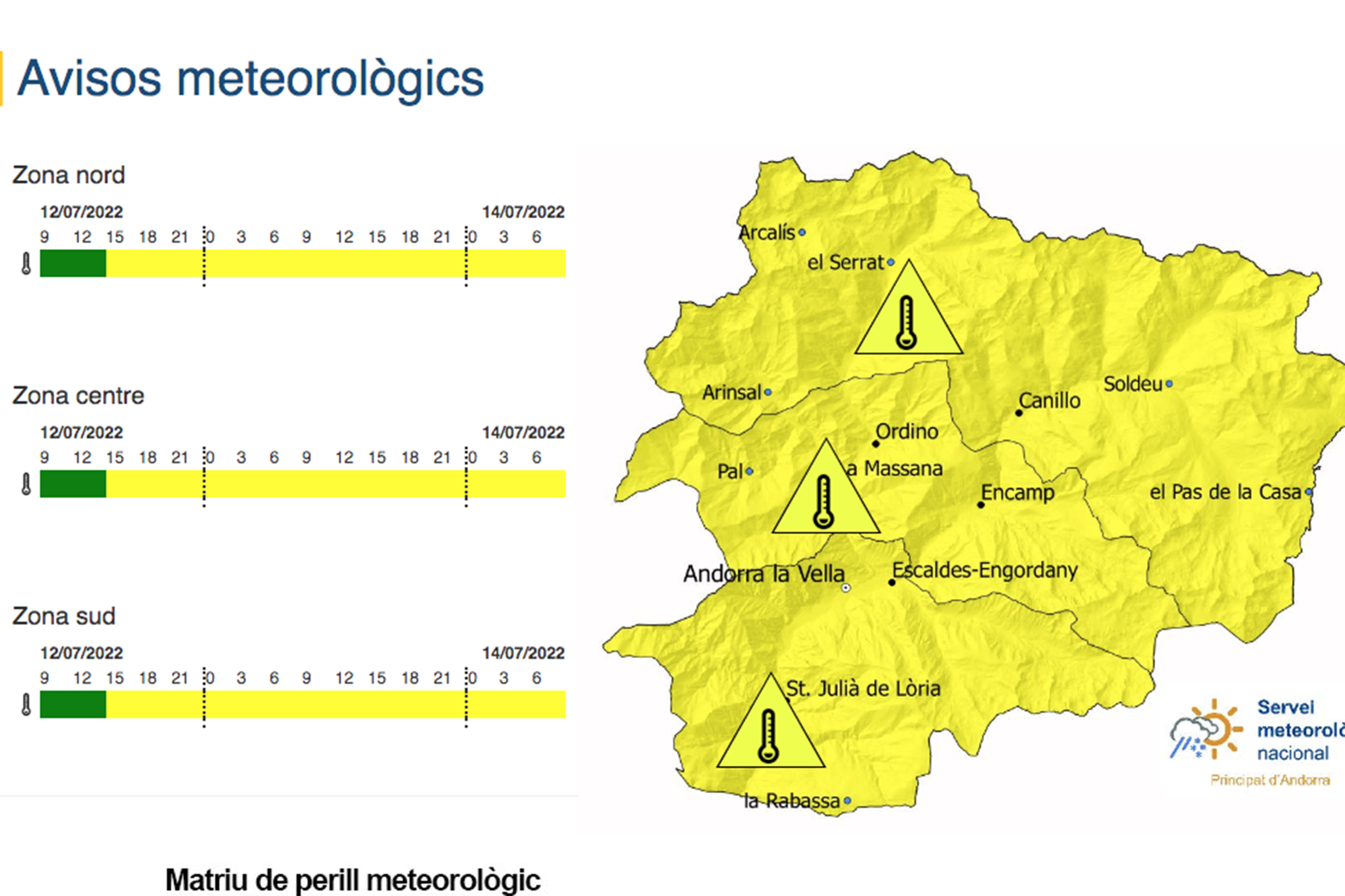 El Servei Meteorològic d'Andorra ha activat avui l'avís groc per les altes temperatures que s'estan registrant al país i que arribaran al pic màxim demà, tal com va explicar ahir la meteoròloga Gemma Sinfreu. La previsió és que durant els propers dies aquesta estabilitat atmosfèrica es mantingui amb domini del sol i una massa d'aire càlid.