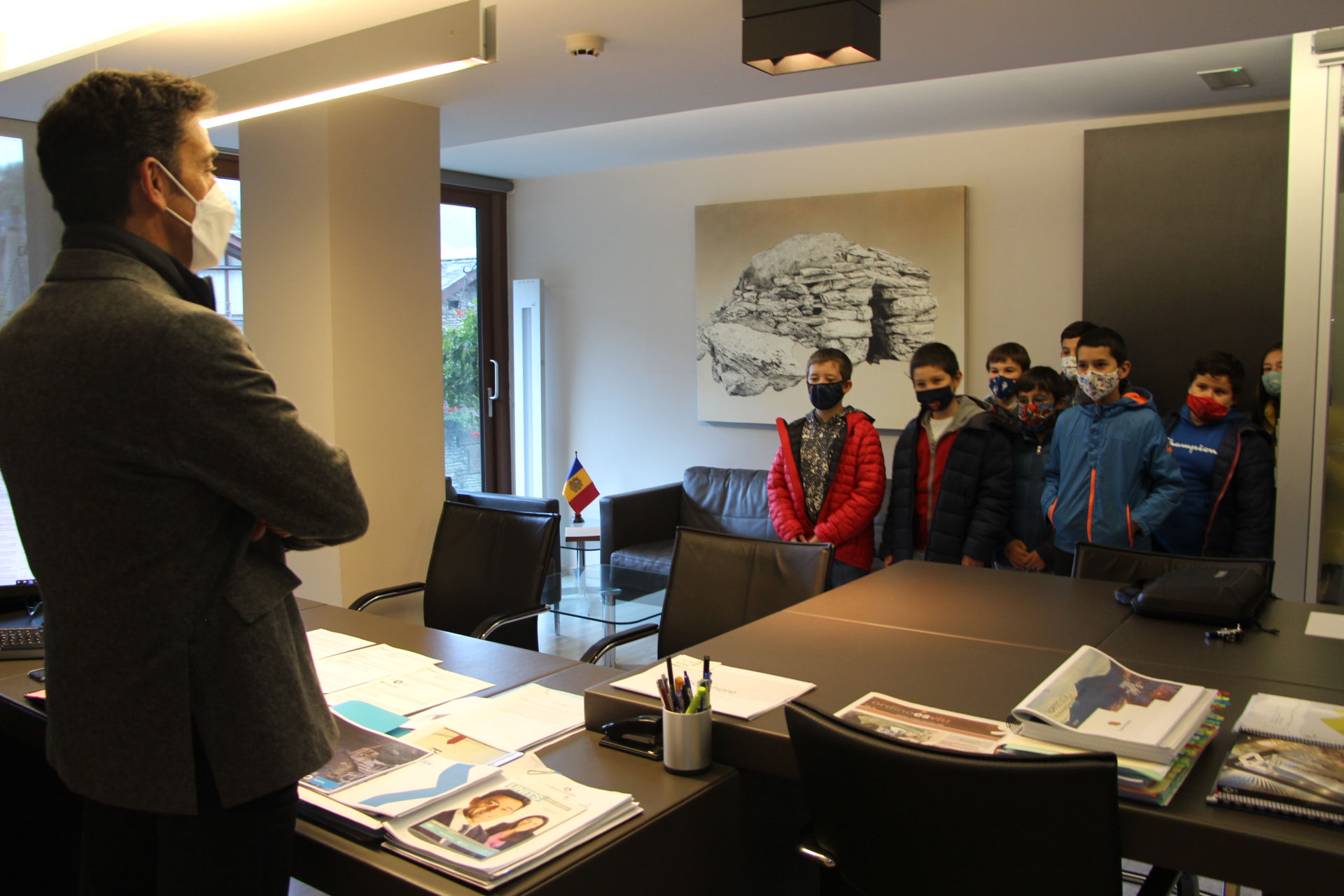 Els cònsols d'Ordino, Josep Àngel Mortés i Eva Choy, han rebut aquest matí la visita dels alumnes de CM2 de l’Escola francesa, que han acudit al Comú en grups reduïts per garantir el distanciament.