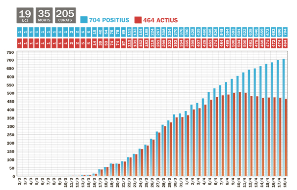 El ministre de Salut, Joan Martínez Benazet, s'ha felicitat per un nou dia sense defuncions a causa de la Covid-19, que pugen a 35, les mateixes que ahir, des de l'inici de la pandèmia. Benazet considera que la corba epidemiològica ha començat a descendre, i una prova n'és la de casos actius, que torna a baixar per tercer dia consecutiu: avui són 464, sis menys que ahir. Els casos totals s'enfilen a 704, vuit mes que divendres, i també hi ha bones notícies en el balanç de malalts curats: avui són 205, catorze més que la jornada anterior. Les xifres són igualment positives en el cas dels sanitaris, avui n'hi ha 61 de malalts, un menys que ahir, i en el membres dels cossos especials, amb onze casos positius, també un menys que divendres.