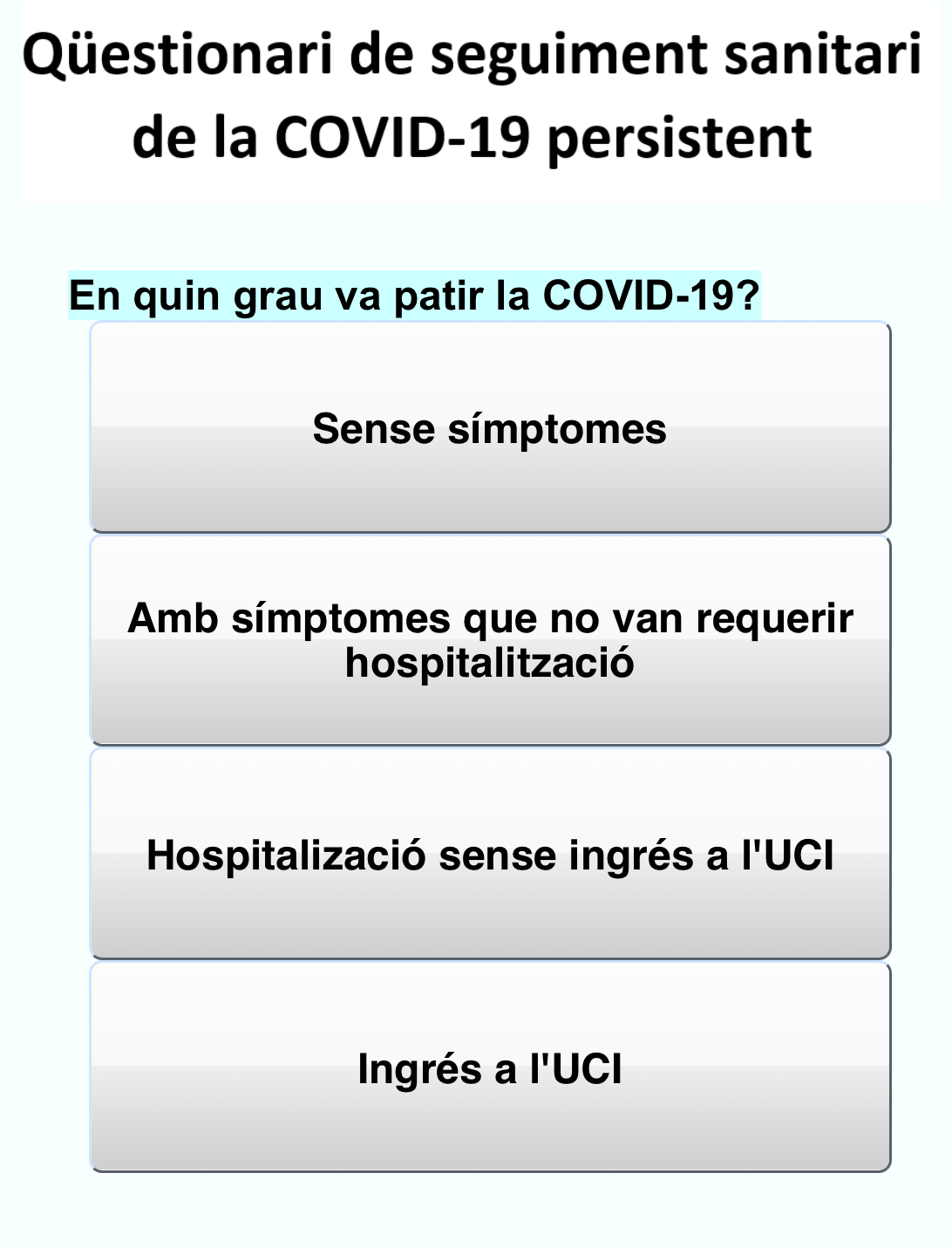 “En quin grau va patir la Covid-19?” és la primera pregunta que entra en matèria. En aquest cas, les respostes possibles són quatre: “sense símptomes”, “amb símptomes que no van requerir hospitalització”, “hospitalització sense ingrés a l’UCI” i finalment “ingrés a l’UCI”. A partir d’aquí, arriba una bateria de preguntes sobre els símptomes àmpliament coneguts, i reconeguts, de la malaltia: “quan es va infectar per la Covid, tenia dificultats per respirar? Febre? Li feia mal el pit? Tenia tos? Dolor abdominal? Dolor muscular o articular? Mal de cap? Va perdre l’olfacte? El gust?”. I encara algunes preguntes més, totes elles amb un desplegable quan la resposta és afirmativa: “actualment encara té aquest símptoma?”.