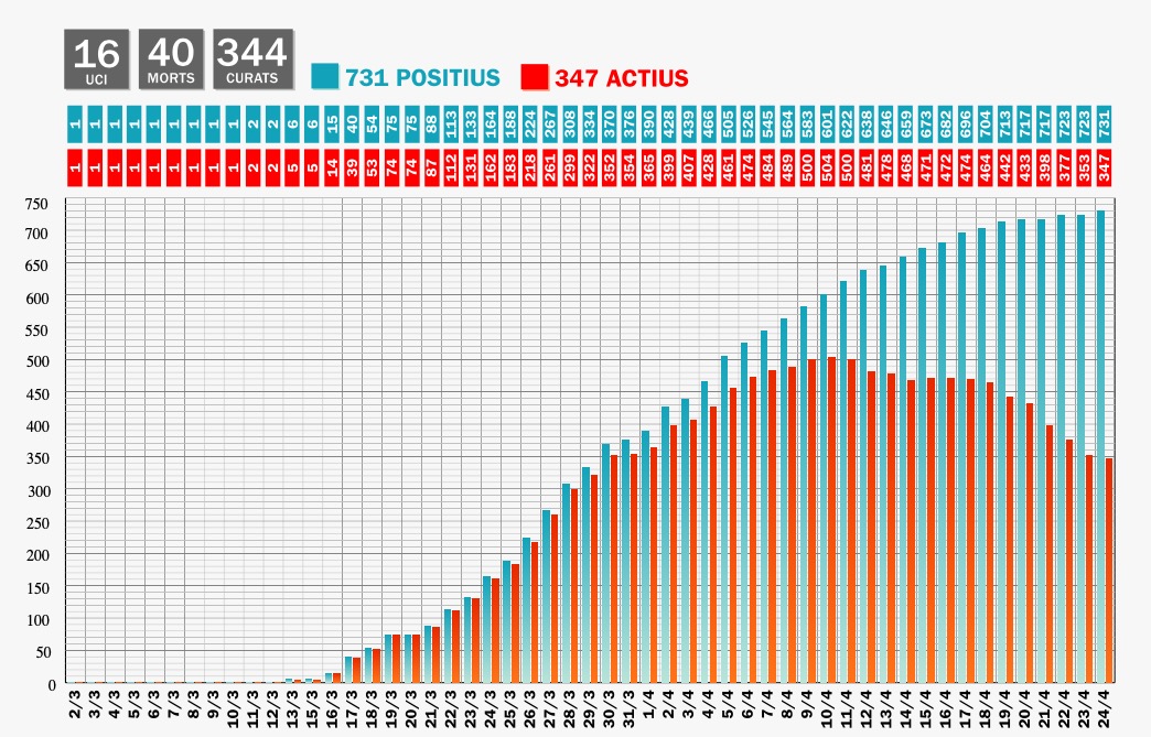 De la mateixa manera es va anunciar un repunt dels casos totals, passant dels 723 que hi havia ahir, a 731, dels quals 347 actius. Pel que fa als curats, s’ha passat de 333 ahir a 344 avui. Entre els casos actius hi ha 49 sanitaris i 7 membres dels cossos especials. Pel que fa a l’hospital, hi ha 29 pacients ingressats (una menys per la defunció registrada) dels quals 13 estan a planta i 16 a la unitat de cures intensives. Dels que estan a l’UCI, 11 es troben sota ventilació mecànica, un pacient menys que ahir ja que aquest va poder sortir d’aquesta fase. Martínez Benazet ha insistit que tot i que “la pressió a l’UCI ha disminuït, encara s’està treballant a un ritme força important”.