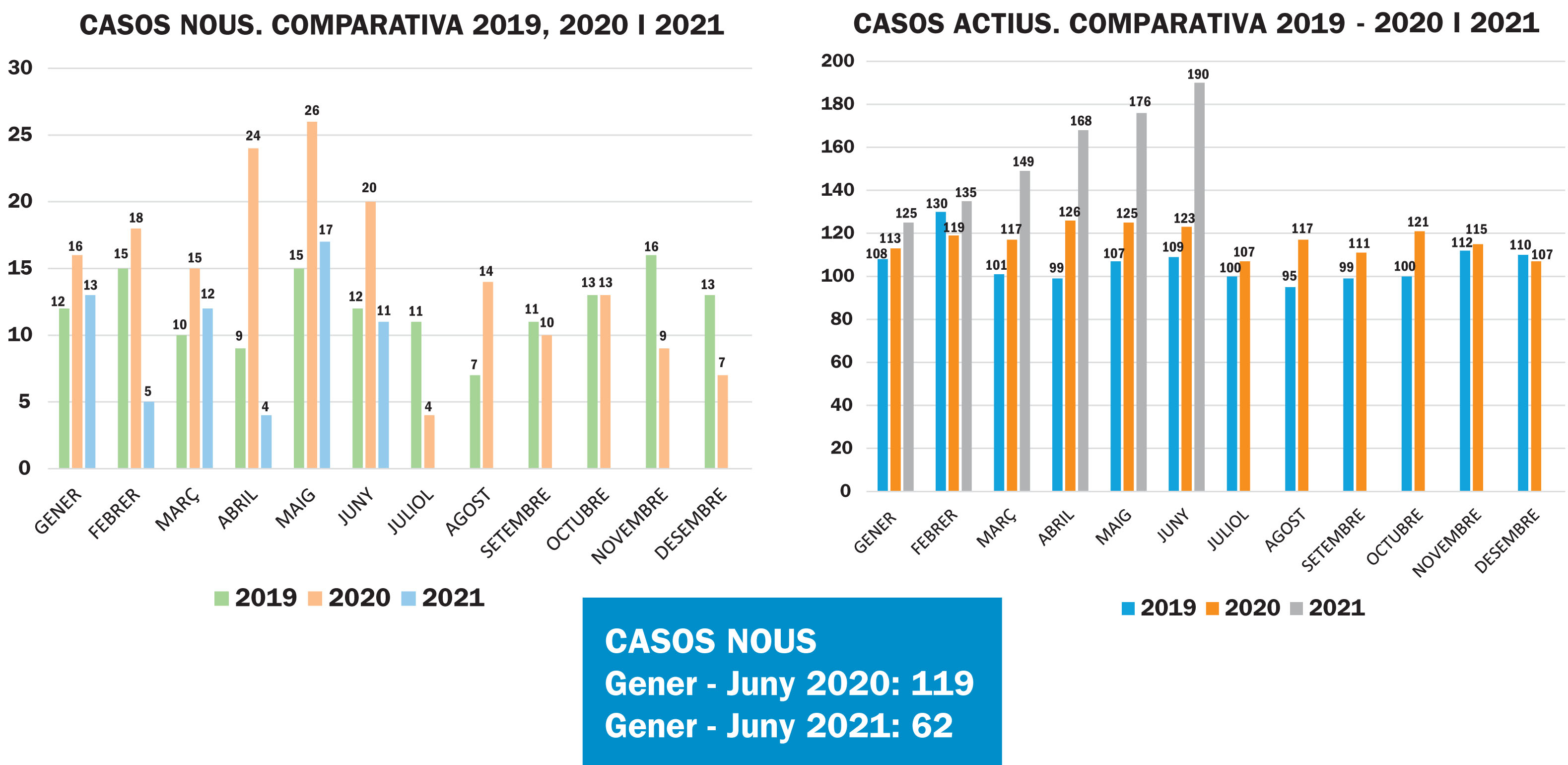 El nombre de casos tractats pel Servei d’atenció a les víctimes de violència de gènere segueix creixent i el mes de juny eren 190 les dones ateses. Això suposa respecte del mateix mes del 2020 un increment del 54,4%. Més important és encara aquest augment si el comparem amb les dades del 2019: un 74,3%. Malgrat això, l’explosió de casos nous que es va viure després del confinament no s’ha mantingut. De fet, aquests han caigut un 47,9%, passant dels 119 entre el gener i el juny del 2020 als 62 del mateix període d’aquest any. Cal tenir en compte que entre els 190 casos totals que atén a hores d’ara el servei n’hi ha que venen d’anys anteriors i d’altres que es van tancar però que han retornat, a banda de les dones que s’hi han adreçat per primer cop.