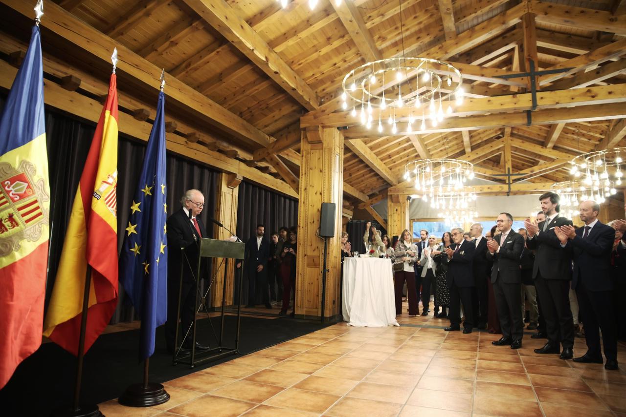 El discurs de l’ambaixador espanyol, Carles Pérez-Desoy, pronunciat avui amb motiu de la festa nacional d’Espanya celebrada a l’Hermitage de Soldeu, no ha sigut especialment diferent del monòleg del curs anterior. Els punts principals: el possible futur Acord d’associació a la Unió Europea, les relacions transfrontereres entre ambdós països –amb especial atenció al Sistema Entry-Exit (EES)– i els afers migratoris, i la “posició compartida” respecte del reconeixement de l’Estat palestí.