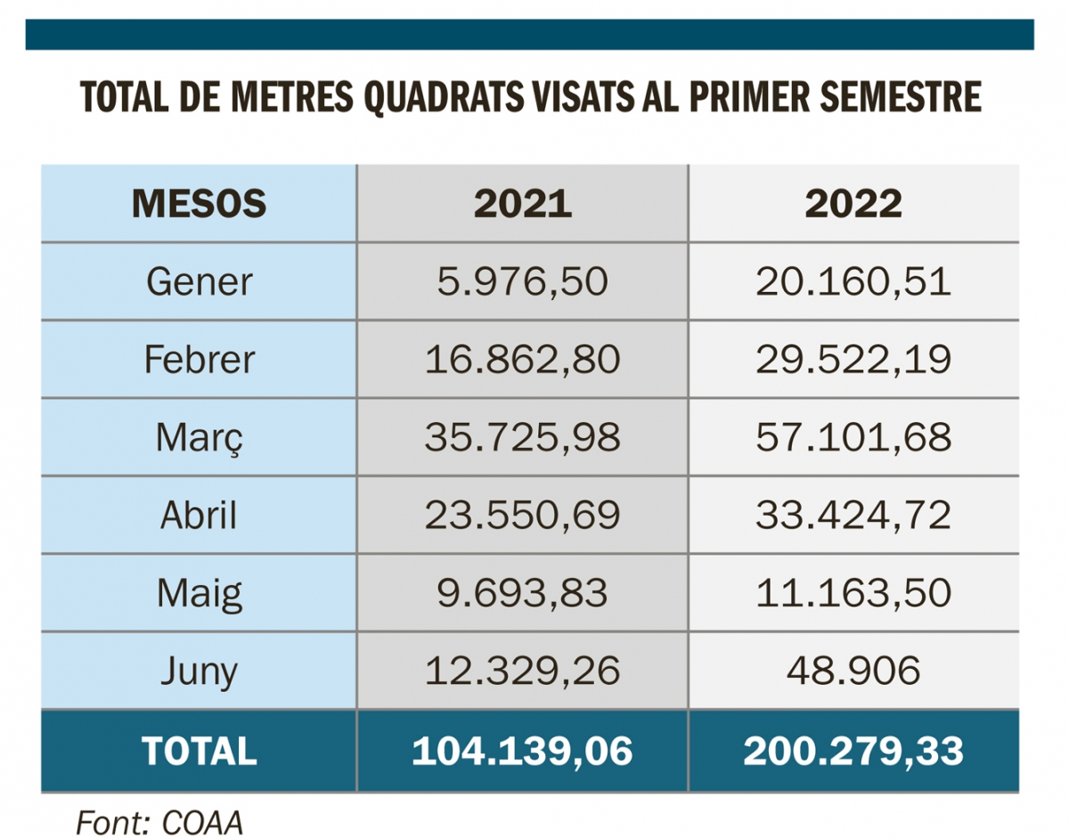 La superfície visada d’obra nova ha assolit xifres rècord durant el primer semestre de l’any si es compara amb les dades corresponents als mateixos mesos de l’any passat. En total han estat 200.279,33 els metres quadrats visats entre el gener i el juny del 2022. Es tracta de pràcticament el doble de metres quadrats visats respecte de l’any anterior, ja que de gener a juny del 2021 se’n van visar 104.139,06. De tota manera cal tenir en compte que va ser durant el segon semestre del 2021 quan es va disparar la superfície d’obra nova visada, assolint al cap de l’any la xifra de 368.759,89 metres quadrats. La dada més elevada de construcció nova es va donar el mes de març amb 57.101,68 metres quadrats, seguit del juny, amb 48.906, i l’abril, amb 33.424,72. El maig, amb 11.163,50 metres quadrats visats, va ser el mes amb la xifra més baixa.