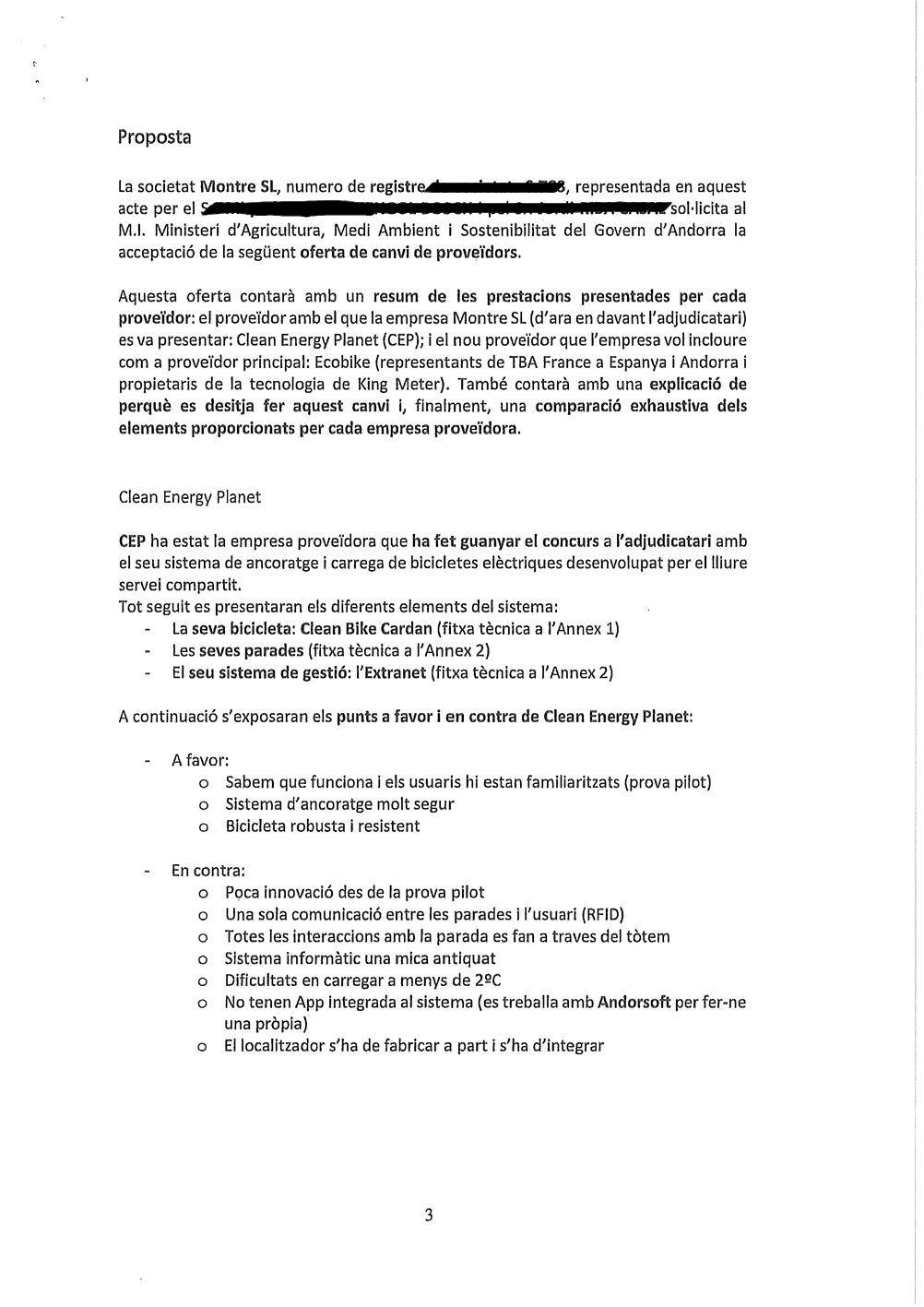 En la carta, Montre també anuncia que amb el canvi de proveïdor es posarà a disposició del Govern 5.000 euros anuals acumulables per a la promoció del servei de bicicleta elèctrica compartida. En la resposta a la sol·licitud, el Govern informa que aprova el canvi de proveïdor tenint en compte que això no modifica ni les finalitats ni les característiques bàsiques del projecte inicial i millora la fiabilitat i la qualitat del servei.