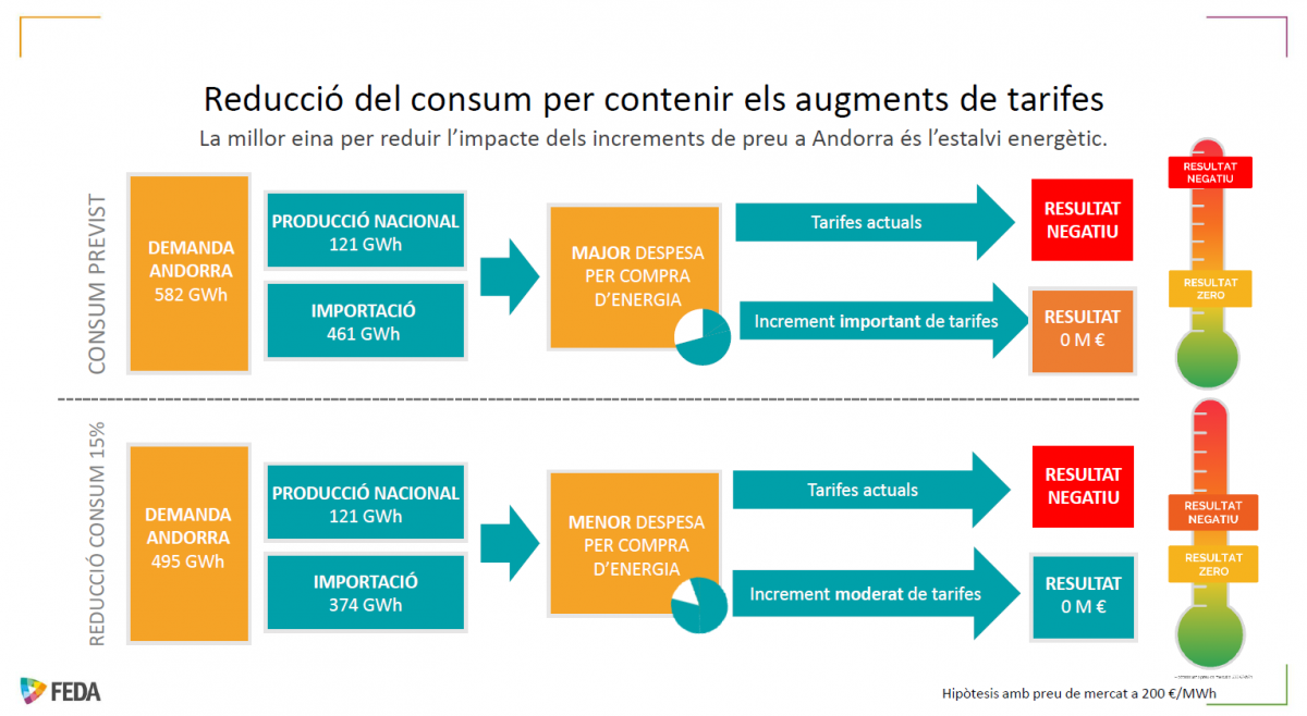L’altra mala notícia que Moles ha compartit avui en una trobada informal amb la premsa és que FEDA proposarà d’apujar ja al gener el preu de la llum. Amb dos escenaris: l’optimista, que les mesures d’estalvi donin fruit i que es pugui reduir en un 15% el consum d’energia. En aquest cas, l’increment de la tarifa seria “moderat”, tot i que tampoc es va atrevir a quantificar-la perquè dependrà, entre d’altres factors, del preu de compra. Per fer-nos una idea, els 15 cèntims el kW que paga avui el consumidor final és entre tres i quatre vegades inferior al preu al qual FEDA adquireix l’electricitat. I és aquesta diferència la que explica els cinc milions de dèficit que la companyia va registrar el 2021 i els deu més que acumulava al juny. “No ens podem permetre un tercer any amb pèrdues d’aquesta magnitud, necessitem recuperar la capacitat d’inversió”. Si no es compleix l’objectiu de retallar aquest 15% el consum, l’increment serà “important”. “Ja podem comptar que entre gener i febrer la llum s’apujarà. El que no sabem és quant. Per això és imperatiu reduir-ne el consum, gest que permetria allargar les reserves de gas i retardar o evitar possibles restriccions de subministrament”. I aquest és l’objectiu de les reunions que les últimes setmanes ha prodigat amb el teixit empresarial. Hi ha percebut bona predisposició –com més estalviem, més allunyarem el fantasma de les restriccions– però de moment pocs resultats: el consum va augmentar al juliol un 7%, i a l’agost, un 2%, en un estiu especialment calorós i amb una gran afluència de turistes.Tot i que es fa difícil de calibrar, ha dit, sí que s’hi pot descomptar cert autocontrol del consumidor. “En qualsevol cas, el que és evident és que el consum no hauria de ser major que l’estalvi, i ens hem de preparar per a un hivern d’escassetat elèctrica”.