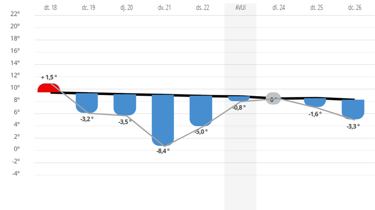 L’estació meteorològica del Roc de Sant Pere ha registrat aquesta setmana un notable descens de les temperatures. Segons el Servei Meteorològic, el gràfic d’evolució mostra com es passa d’una anomalia positiva de +1,8 °C el dimarts 18 de novembre a cinc dies consecutius de valors sota zero, amb el punt més fred el divendres 21 de novembre, quan el termòmetre va caure fins als –8,4 °C.
