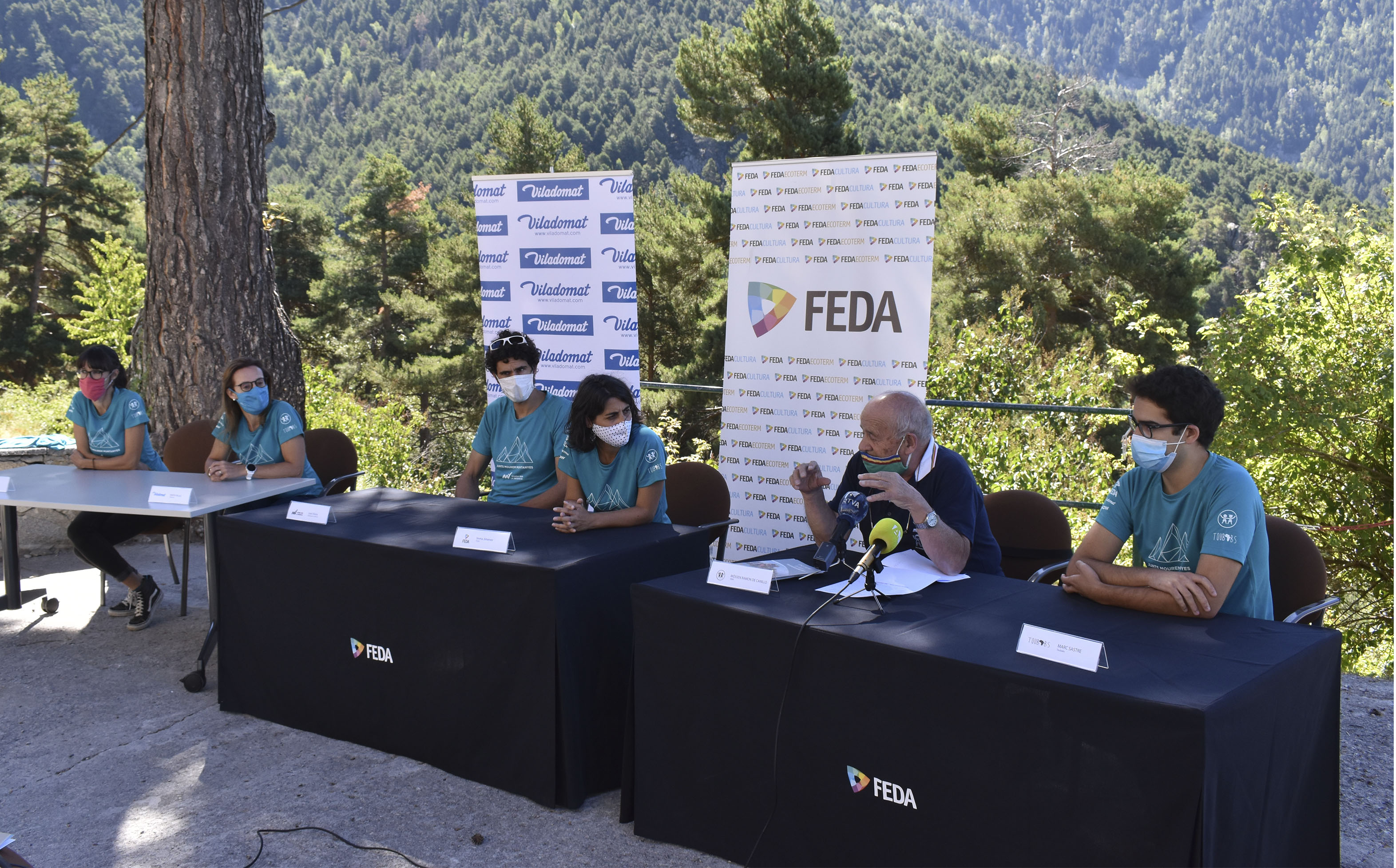 Joan Vilana, de Ronda per la infància; Imma Jiménez, directora d’activitats de creixement de FEDA; Marta Palau, de Viladomat i els dos representant de les dues associacions agraciades, mossèn Ramon de Canillo, d'AINA, i Marc Sastre, de Toubabs, han presentat aquest dimecres la quarta edició de les samarretes solidàries Ronda per la infància. “S'ha creat una inèrcia i la gent ja ens les demana abans que les fem, això ens encoratja a tirar endavant, i encara més en un any difícil com el que estem vivint”, ha explicat Vilana, per afegir que en aquesta edició han tingut “més col·laboradors que mai”. Tot plegat amb un doble objectiu: “donar visibilitat a les institucions que ajudem i aportar-los fons econòmics perquè puguin tirar endavant el millor possible la seva tasca”.