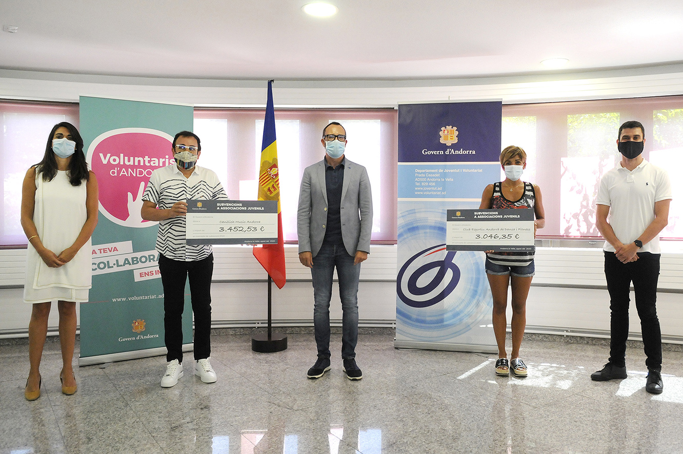 El ministre d'Afers Socials, Habitatge i Joventut, Víctor Filloy, ha lliurat aquest dijous els xecs amb les subvencions per a les associacions juvenils i entitats que ofereixen serveis a la joventut d'aquest 2020. En total, Filloy ha entregat 6.498,88 euros, repartits entre les dues associacions que s'han presentat enguany a la convocatòria. D'aquesta manera, el Canòlich Music Andorra ha rebut 3.452,53 euros i Club Esportiu Andorrà de Dansa i Fitness ha rebut 3.046,35 euros.