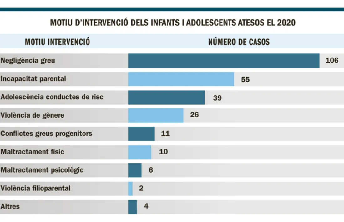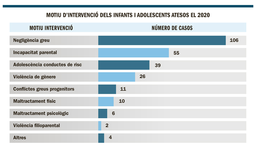 Per darrere hi ha un altre motiu d’intervenció que s’està donant els darrers anys que ve motivat pels conflictes greus entre progenitors separats i que poden afectar l’estat emocional dels infants. En menor mesura es troben el maltractament físic i psicològic esmentats a l’inici, i tot seguit els casos de violència filioparental, amb dos menors atesos el 2020. Uns altres 4 infants i adolescents van ser tractats per altres motius.