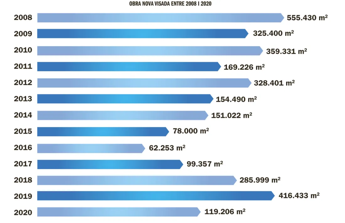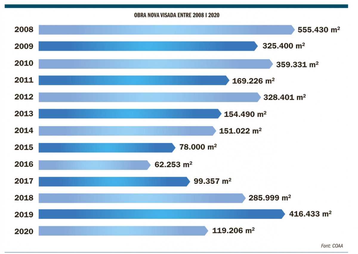 Fent una retrospectiva, el pic de la construcció es va viure l’any 2003 arran de la moratòria. En un sol any es van visar 3,2 milions de metres quadrats d’obra nova. Amb el boom del totxo, el 2008 es va arribar als 555.430 metres quadrats visats. A partir d’aquesta data, les xifres van anar a la baixa fins al 2016, quan es va tocar fons. Aquell any tan sols es van visar 62.253 metres quadrats d’obra nova. Des del 2017 fins al 2019 es va viure una recuperació del sector (es va passar de 99.357 a 416.433 metres quadrats visats). El 2020 va trencar la tendència, amb 119.206 metres quadrats.
