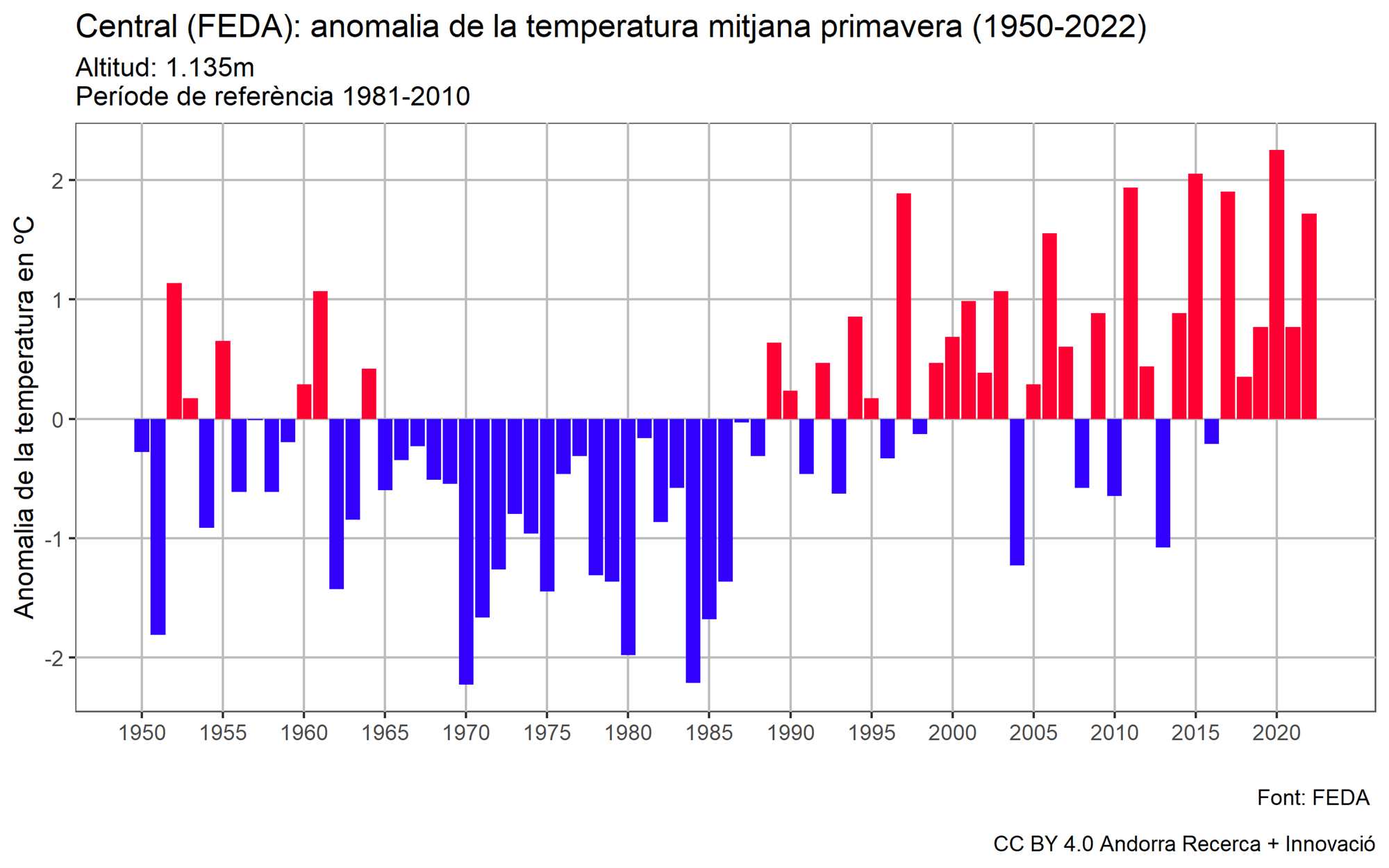 Entrant al detall, per mesos, l’estació ha registrat al març fins a quinze dies de temperatures per sota de la mitjana i a l’abril vuit dies dLa temperatura mitjana que s’ha registrat aquesta primavera ha estat de 10,45 graus, el que suposa 1,7 graus per sobre de la mitjana climàtica pel període de referència del 1981 al 2010 a l’estació central de FEDA, segons publiquen des d’Andorra Recerca + Innovació (ARI). e temperatures fredes. Ara bé, de cara al maig, el mes va ser molt càlid i es van superar rècords de temperatura i només cinc dies de clima habitual per a l’època de l’any.