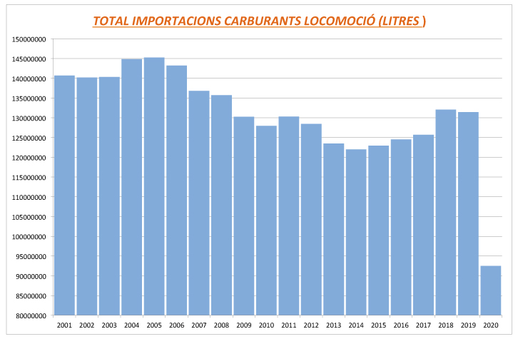 Fent atenció a les importacions de carburant de calefacció i de locomoció, el 2020 es van vendre 140,5 milions de litres, el que suposa una reducció del 23,3% respecte dels 183,3 milions de litres acumulats en el mateix període de l’exercici anterior, segons informa el departament d’Estadística.