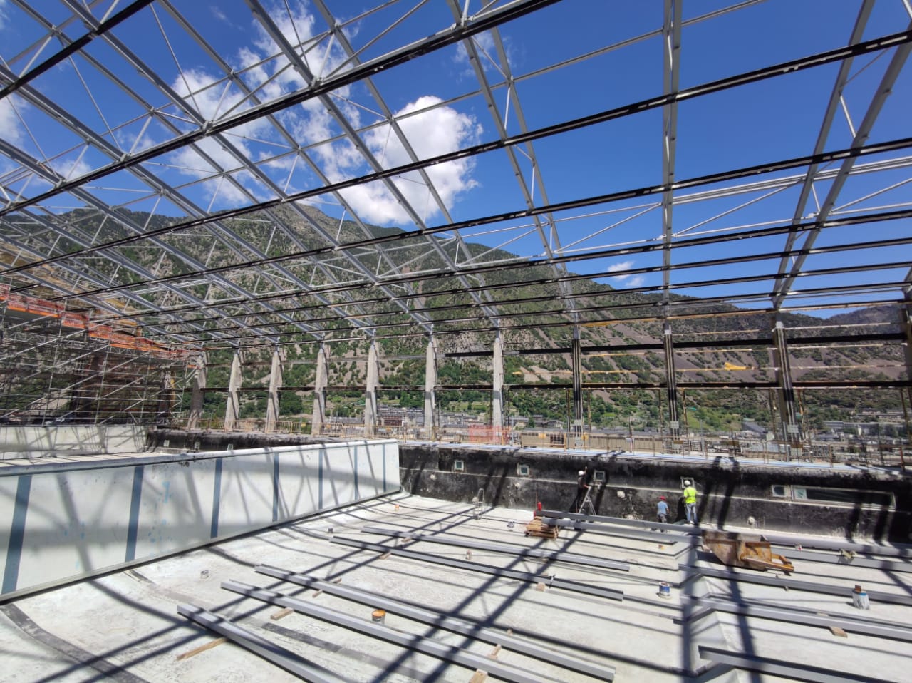 Mentrestant, les obres de la piscina interior avancen segons el calendari previst. Van començar el mes de febrer i en aquests quatre mesos s’han reforçat les estructures, netejant-les i galvanitzant-les, i s’han enderrocat les façanes. A més, s’ha aprofitat per treure les rajoles de l’interior de la piscina i la cobertura de plàstic. D’aquí a una setmana o deu dies començarà el recobriment del sostre i les façanes. L’edifici “ja començarà a agafar la forma que estem més acostumats a veure”, ha declarat la cònsol major.