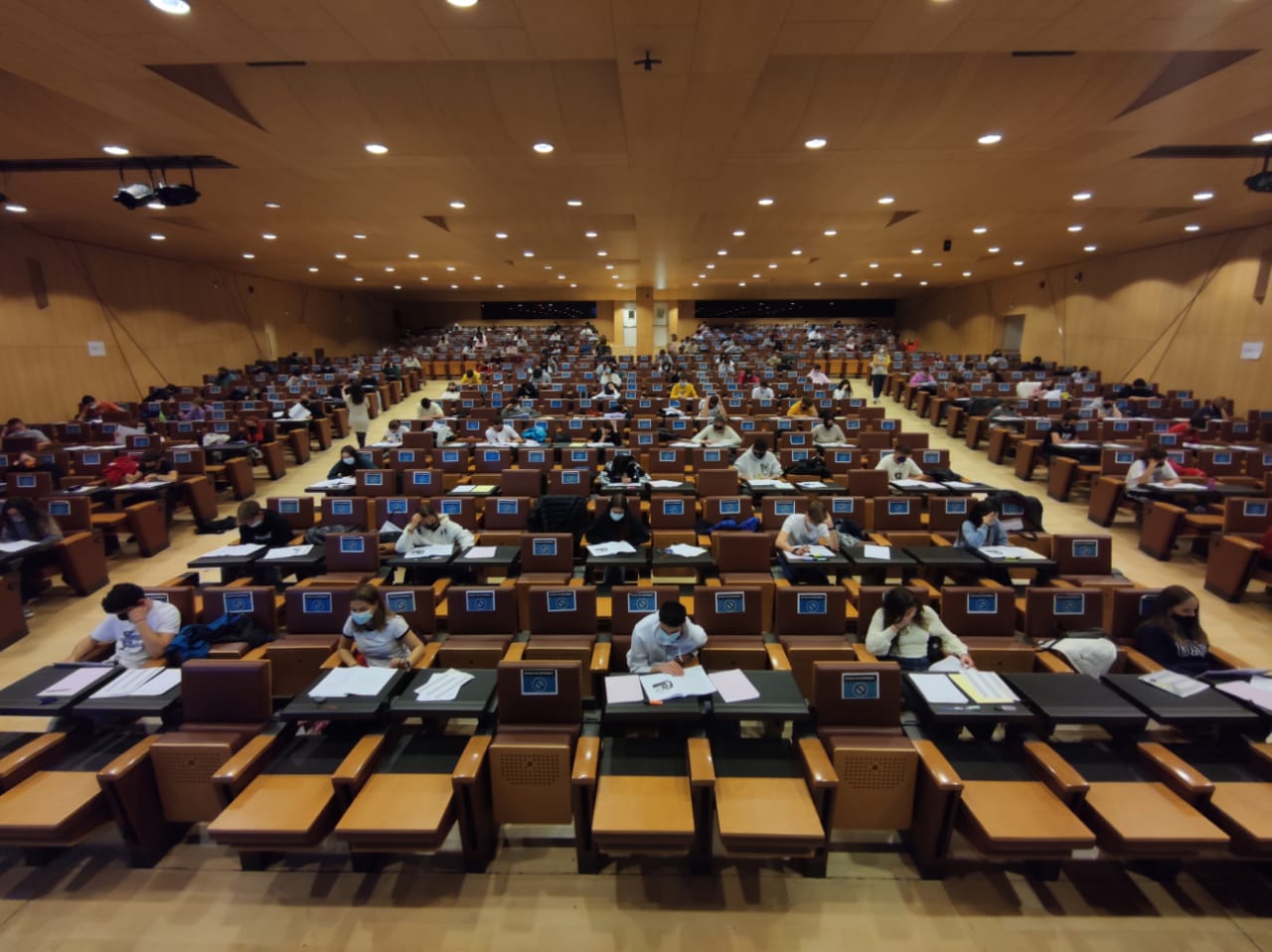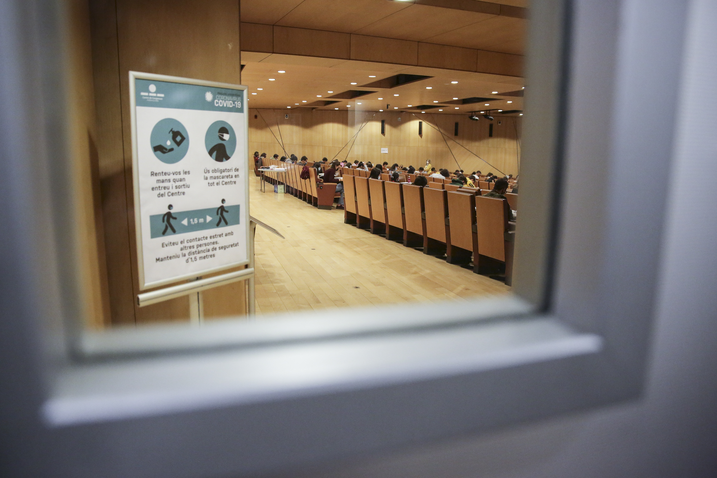 Els alumnes estaven convocats i distribuïts per grups a la plaça del Poble i des d’allà se’ls cridava amb un megàfon segons els cognoms i s’adreçaven a l’entrada del Centre de Congressos on es controlaven els passaports i se’ls assignava un dels dos espais habilitats per a realitzar les proves, un protocol que segons Pagès “està funcionant molt bé”. Abans de baixar les escales i d’entrar a les aules, el gel a punt; i, a dins, taules amb la distància de seguretat reglamentària.