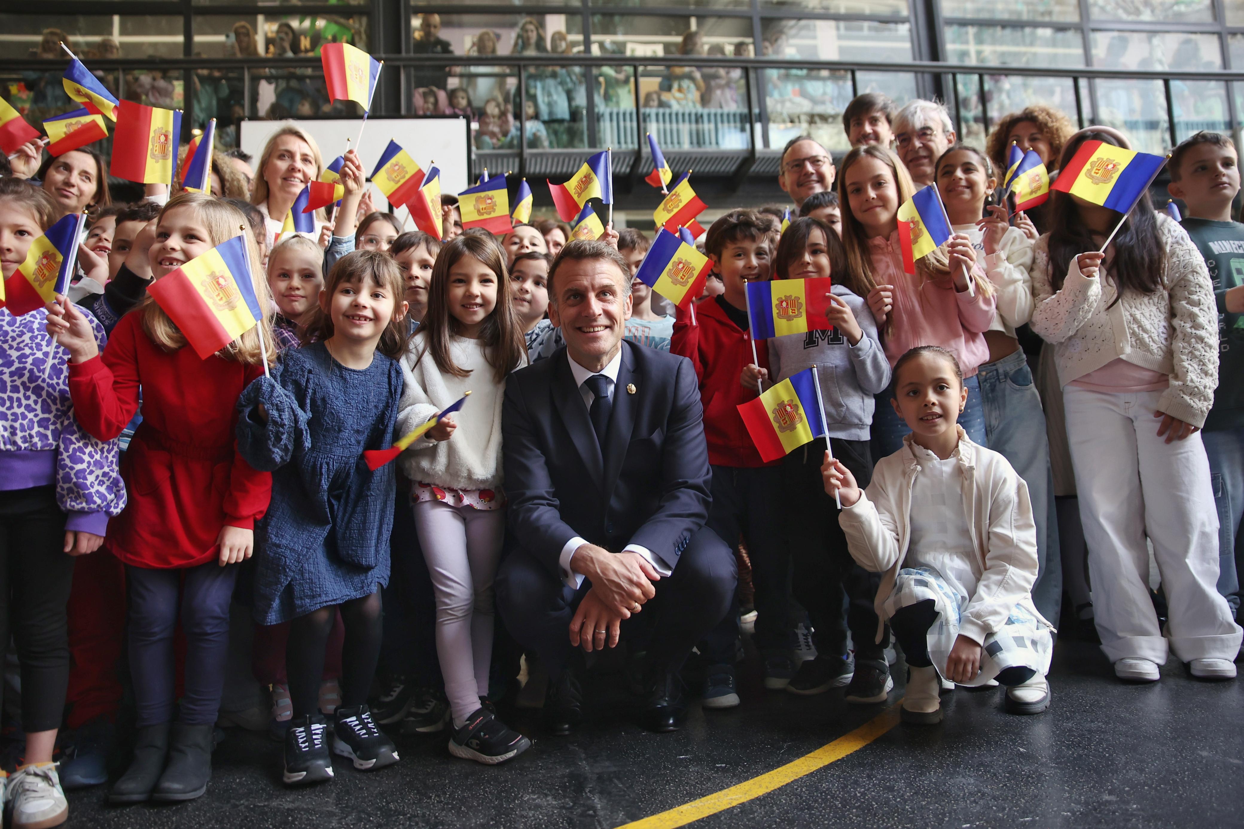 Acabada la visita al Lycée Comte de Foix, el copríncep Emmanuel Macron s'ha desplaçat a l'Escola Andorrana de Santa Coloma, on al patí central l'esperaven tots els alumnes de primària, amb els infants de maternal observant atentament engantxats al vidre del primer pis.