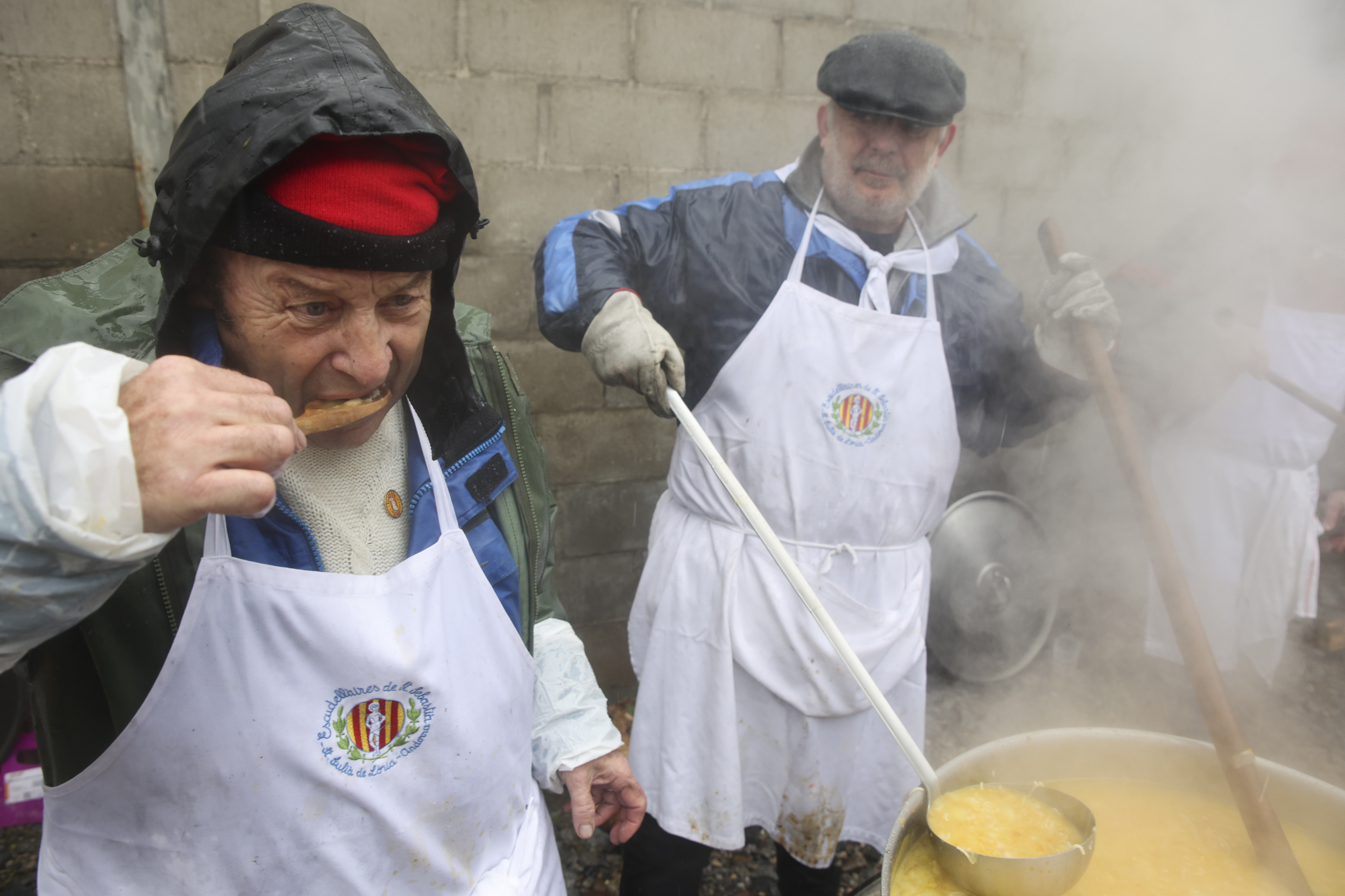 Per sort el Comú havia previst paraigües per a les autoritats i un anorac corporatiu. Tots dos de color negre com el paraigua que portava mossèn Pepe amb un cel blau dibuixat amb algun núvol. La seva arribada no va aturar el mal temps i per si no hi havia prou aigua en va afegir amb la seva benedicció. El secretari de l’organització, Bruno Bartolomé explica que s’utilitzen 450 quilos de carn, 250 quilos de verdures, mongetes, arròs i pasta en sis olles que es barregen abans de servir per garantir un gust homogeni, mentre que una d’elles es reserva per als mateixos escudellaires i entre ells gent jove. “És una gran satisfacció que la gent jove s’hi acostumi i que torni a les tradicions”, diu l’escudellaire major Pere Obiols, al costat d’Antonio Besolí de cal Guardiet amb la seva inseparable màquina de fotografiar. “Quin arxiu deus tenir!”, li comenta la consellera general laurediana Carol Puig.