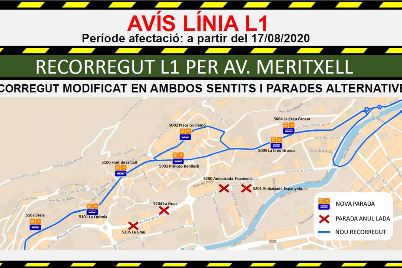 Les obres de la xarxa de calor que FEDA està construint a la capital tindran afectació sobre el transport públic en les setmanes vinents. Així, la línia de Sant Julià de Lòria, és a dir l’L1, veurà modificat el seu recorregut a partir de dilluns 17 d’agost. Les parades de l’ambaixada espanyola i de la Grau seran anul·lades i els busos passaran per l’avinguda Meritxell i Príncep Benlloch, on s’han habilitat les de la Creu Grossa, Príncep Benlloch, plaça Guillemó, font de la Call, la Quirola i l’Stela.
