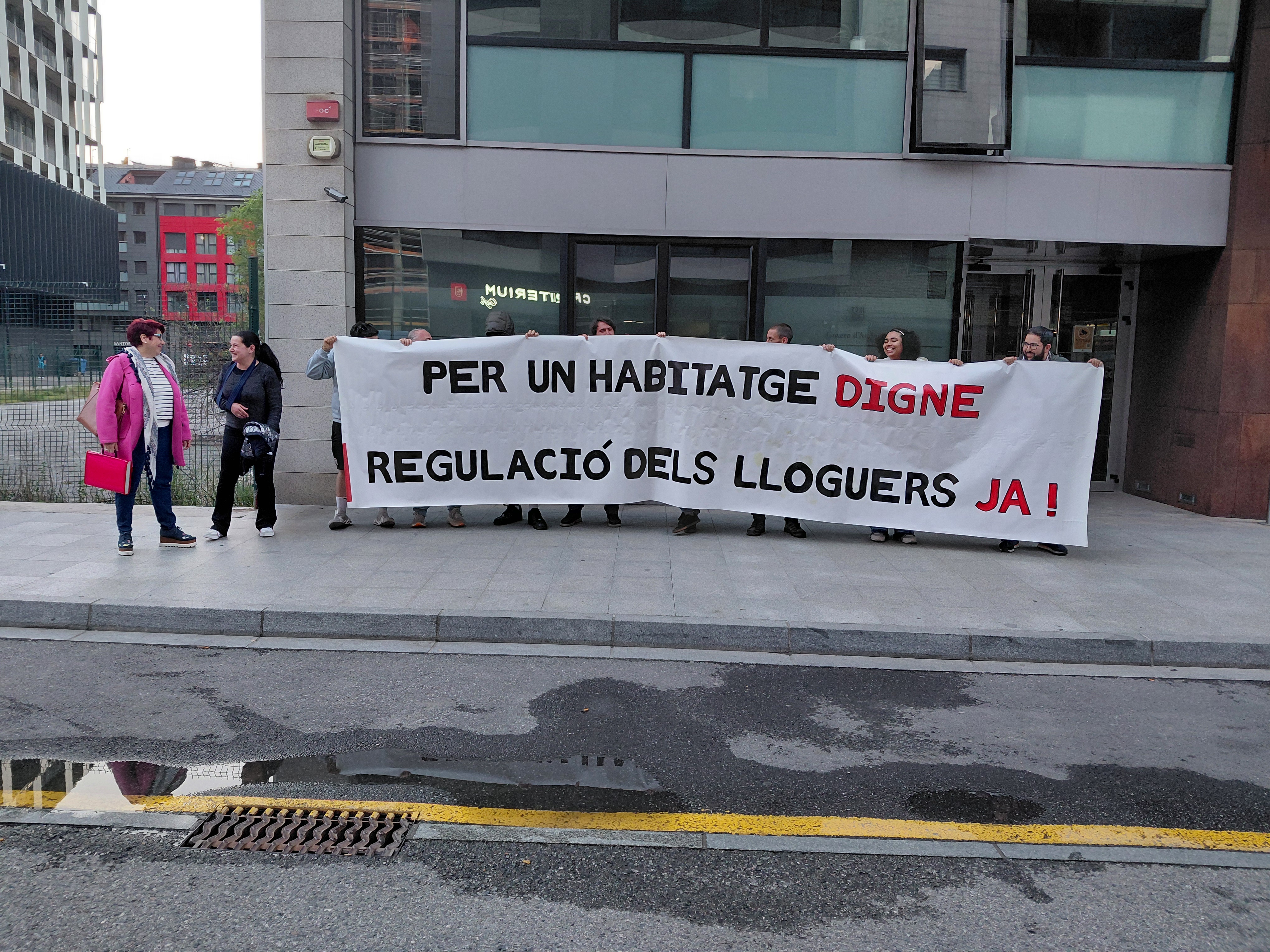 Durant el transcurs de la reunió, una quinzena de persones s'han concentrat davant les portes de l’edifici administratiu de Prat del Rull reclamant la regulació dels lloguers i criticant la política de l'executiu en matèria d'habitatge.