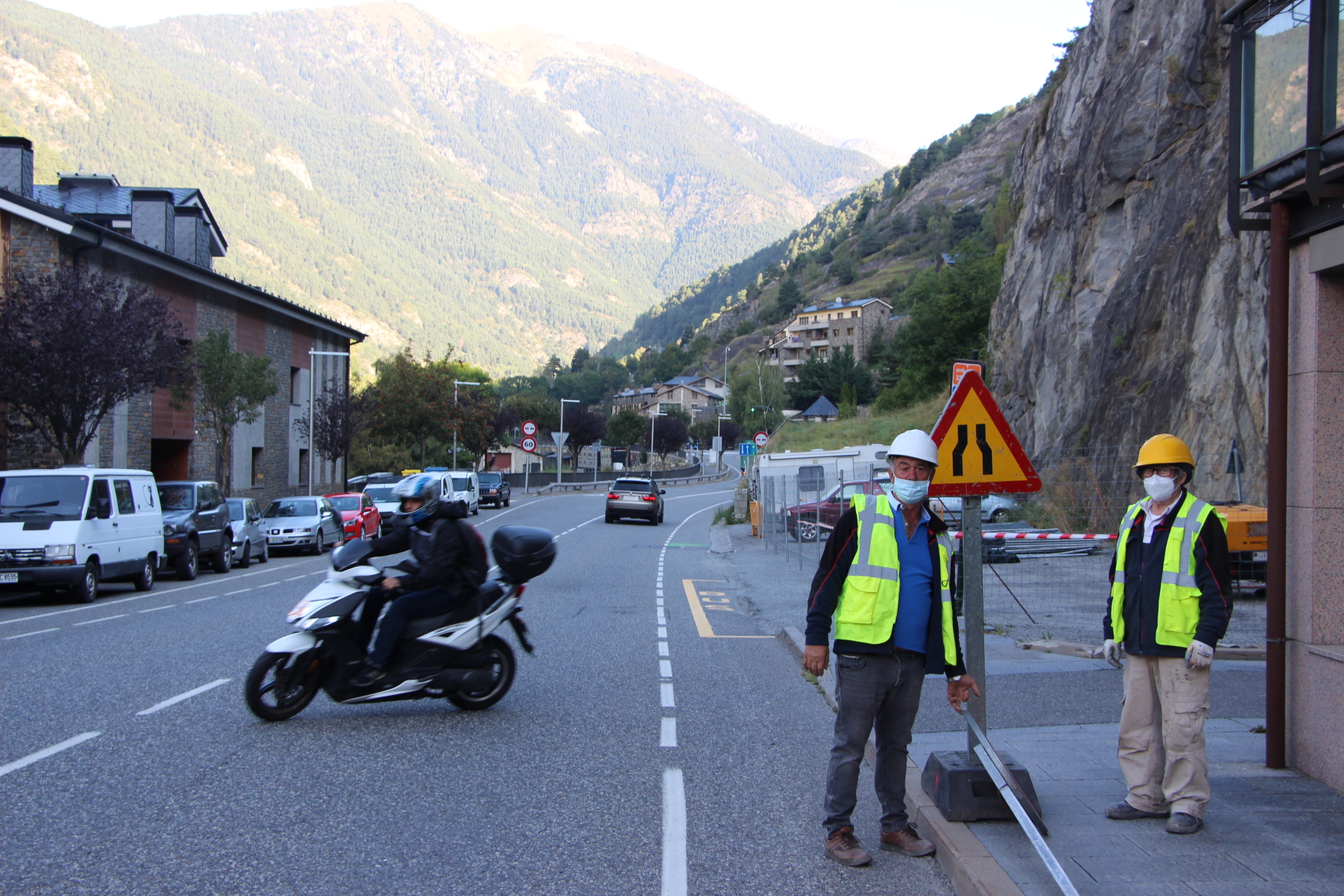 Els treballs, adjudicats a l'empresa Progec SA per un import de 94.234,97 euros, consistiran en reforçar el mur de l'aparcament amb la col·locació d'una malla de triple torsió pel sosteniment de pedres i a l'adequació del terreny per habilitar-lo com aparcament de vehicles, com a principals intervencions. Hi ha previst delimitar catorze places d'aparcament, una per a vehicle elèctric i una altra reservada per a usuaris amb mobilitat reduïda. També es preveu la col·locació d’un parquímetre. A la imatge, es veuen dos operaris que instal·len la senyalització de l'obra amb l'estretament de la via i la reducció de velocitat.