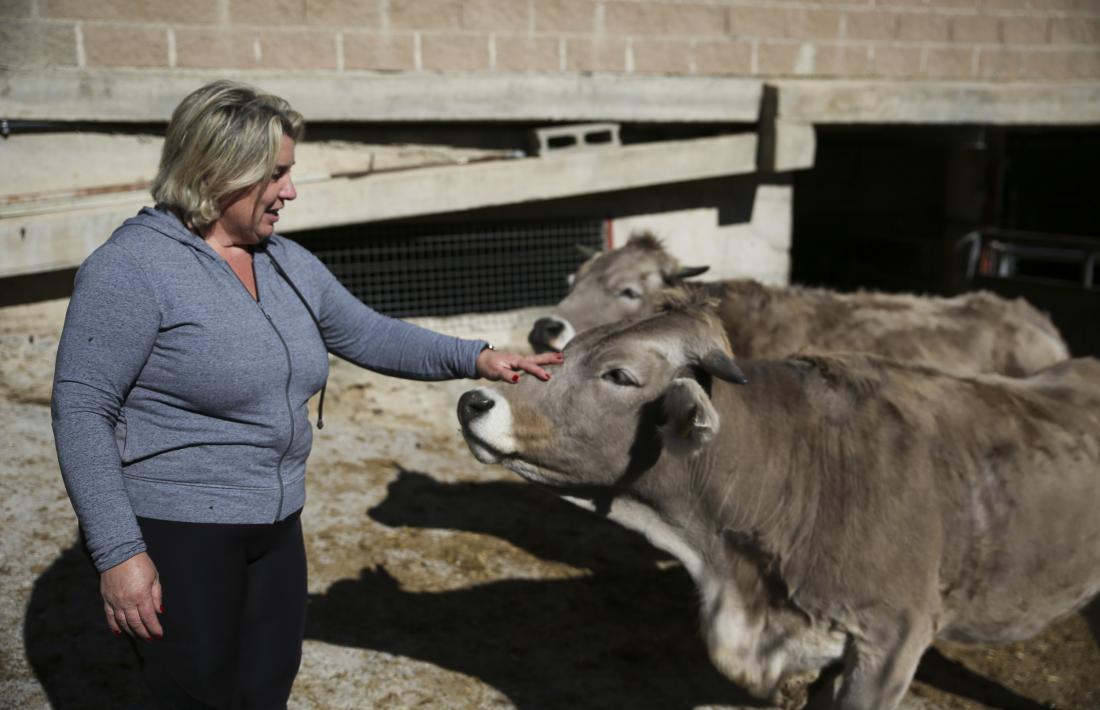 Això no vol dir que les quadres del cortal de Llumeneres estiguin buides. En elles hi ha el toro semental, els vedells d’engreix i dues “noies”, és a dir, dues vaques que encara no tenen els vint-i-quatre mesos i, per tant, no han pogut anar a la muntanya per evitar possibles “ensurts”. “La cria està totalment controlada i esperem que les vaques estiguin en el punt òptim de desenvolupament ossi i muscular abans no quedin prenyades. Seria un risc per a elles i per als vedells si no ho féssim així”, aclareix la Txell. Ella mateixa és mare i confessa que, al principi, que no havia tocat mai els animals, ho passava “fatal” per les vaques quan estaven a punt de parir perquè “sabia com se sentien, com patien”. “Fins que un dia canvies el xip i et dius a tu mateixa que t’hi estàs dedicant per fer una producció, per tenir-ne un rendiment, i et fiques les piles”. Dit així podria semblar que la Txell va fer un canvi radical en la seva manera de tractar les vaques, però no és així en absolut. Ella hi xerra i les mima amb un rosegó de pa, o se’n preocupa quan veu que alguna està trista. “Els animals són, en realitat, els meus companys de feina i procuro que estiguin el millor possible. Això, a més, es nota en el producte final”, proclama la ramadera.