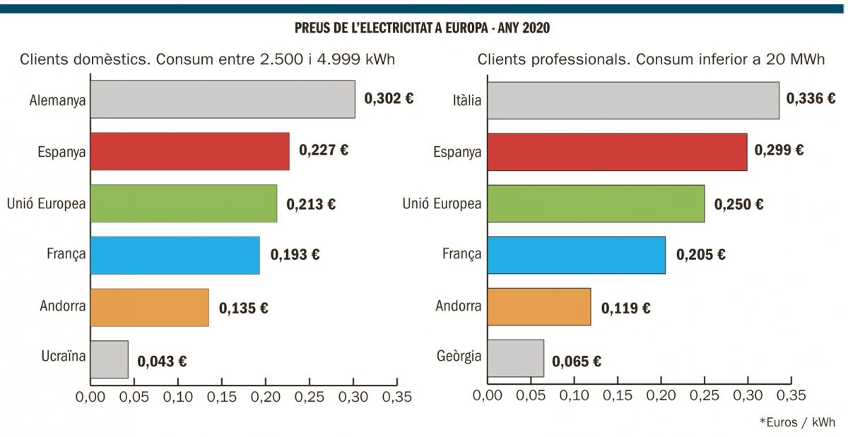 Quant a les xifres d’Eurostat, el grup de clients andorrans que se situen a la forquilla d’entre 2.500 i 4.999 kWh mesurada per l’organisme europeu suposa el 32,35% del total. En el rànquing global, el Principat se situa en dissetena posició per la cua, amb vint-i-cinc països per sobre. El país europeu que paga més cara l’electricitat és Alemanya, amb un preu de 0,302 euros per KWh, mentre que el país amb el millor preu és Ucraïna, on el kWh costa 0,043 euros. Sense tenir xifrats els augments de preus que hi ha hagut l’any 2021 a Espanya però també a França, Eurostat publica que els preus del kWh en aquests dos països eren, el segon semestre del 2020, de 0,227 euros i 0,193 euros, respectivament.