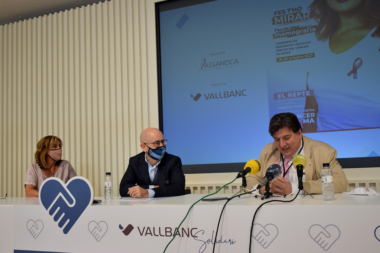 Al llarg d'aquest any l'Associació Andorrana Contra el Càncer (Assandca) té previst dur a terme, amb la col·laboració de Vall Banc, quatre campanyes centrades en diferents tipus de càncer. Aquest mes d'octubre arriba la tercera acció, centrada en la detecció precoç i la prevenció del càncer de mama. D'aquesta manera s'ha creat un espot i es distribuiran diferents consells a través de les xarxes socials encaminats a "trencar tabús i sensibilitzar sobre la detecció precoç", tal com ha posat en relleu el director general de negoci de Vall Banc, Sergi Martín. El president d'Assandca, Josep Saravia, ha destacat que si s'extrapolen les dades d'Espanya a Andorra tindríem que es detecten entre 360 o 390 casos de càncer a l'any i que d'aquests entre 50 i 60 serien de càncer de mama.